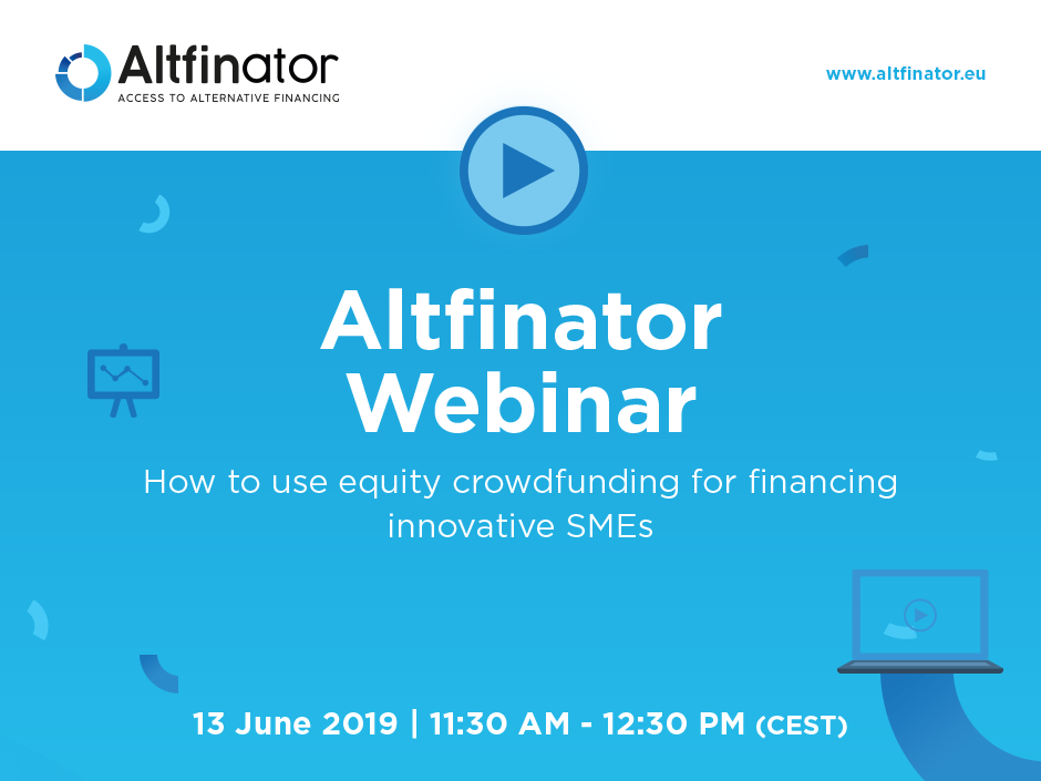 Altfinator aims at stimulating alternative finance instruments (other than bank finance) among innovative SMEs. A professional equity crowdfunding online platform will present what are the benefits for SMEs of this type of finance, what might be the risks and how they are mitigated, and how it works in practice. An innovative SME will tell its successful experience in raising finance through equity crowdfunding, how/why they decided to use this financing instrument? How they got to succeed in the finance raising campaign? What should be considered by SMEs when raising this type of finance? The webinar will end with a ‘questions & answers’ session. You can register here! https://register.gotowebinar.com/register/8513668466259873548(si apre in una nuova finestra)