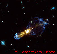 A team of Spanish and US astronomers using the NASA/European Space Agency (ESA) Hubble Space Telescope have for the first time observed complex gas structures in planetary nebula predicted by astronomical theory. Planetary nebula, or gas clouds, arise when dying stars expel gaseous material in opposing directions at great speed. This happens when the inside of the star shrinks and heats up, blowing off the outer parts. The force of these expulsions, which can reach velocities of up to one and a half million kilometres per hour, can give rise to supersonic shock fronts. Eventually, our own sun will die in a similar event, five billion years from now. Scientists from the Observatorio Astronomico Nacional, Spain and the Jet Propulsion Laboratory, USA observed gas flows in the Calabash Nebula, a proto-planetary nebula surrounding a cool and dying star. The scientists were able to see shock fronts formed by the impact of high speed gas streams ejected by the star. Although computer calculations have predicted the existence and structure of such shocks for some time, the observational evidence has so far been poor. This new Hubble image has been able to document the shocks in impressive detail. Using filters that only let through light from ionised hydrogen and nitrogen atoms, the astronomers were able to distinguish the warmest parts of the gas heated by the violent shocks and have found that they form a complex double-bubble shape. Valentin Bujarrabal of the Observatorio Astronomico Nacional, Spain, said: 'This is the first time that these shock components have been seen clearly in such a nebula. The deep, high-resolution images show the complex structure of the shocks in great detail, which we can now compare with predictions from computer models.' The Hubble image was taken shortly before Christmas 2000 using the Wide Field and Planetary Camera 2 (WFPC2) instrument. The Hubble Space Telescope is an international project involving the ESA and NASA.