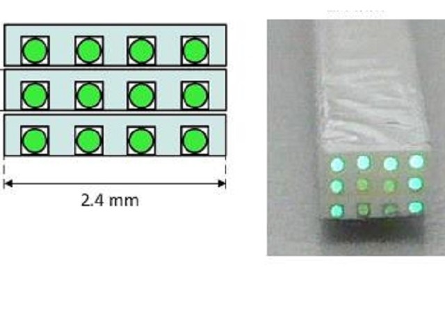 A scintillator is a material that emits light when a particle has hit it. If this light is then measured and converted into an electrical signal we can use this information to find out interesting information about the original particle. If we can also divide the signal caused by the particle into both an X- and a Y-coordinate we can gain two-dimensional data. This is the process that SINE2020 scientists Malte Hildebrandt, Jean-Baptiste Mosset and Alexey Stoykov, based at PSI in Switzerland, want to achieve to make new 2D position sensitive neutron detectors that could provide an alternative to helium-3 detectors. These will be great for the ESS and other neutron sources as helium supplies are expensive to source. The team have been investigating two different approaches for these new designs and for both the following components were used: 1. Scintillating material – in these detectors, the neutron is the particle we want to study. Now we need a material that can emit light when a neutron has hit it. This is not always easy as most scintillating materials are only sensitive to charged particles and neutrons are neutral. The scintillation material of choice is ZnS activated with Ag which is known to have a very high scintillation efficiency. However, in order for it to be sensitive to neutrons, the material also needs to incorporate Lithium-6. When neutrons hit the 6Li, charged particles are produced in the resulting reaction which can then trigger the ZnS:Ag to release light. 2. Collection and Transfer of light – A component needs to transfer the light from the scintillation reaction to the photomultiplier. Specifically, wavelength shifting (WLS) optical fibers were used. These fibers are doped with special dyes that absorb light of one colour and re-emit in another. 3. Conversion of light into an electrical signal – We need an efficient way of turning our collected light signals into electrical pulses so that we can analyse the data. Silicon photomultipliers were used. They are compact, inexpensive, well-established and well suited to multi-channel detection systems. In order to collect two-dimensional co-ordinates to achieve 2D position sensitivity, two different designs were developed. a) The 2D pixelated detector In this design each individual pixel in the detector consists of a scintillator and is separately connected to the silicon photomultiplier via a WLS fibre. The pixels can then be arranged in a 1D or 2D array as required. For the project, a 1D prototype was built and compared to a helium-3 detector. The high yield of detection possible in this design has led to a high trigger efficiency and low sensitivity to gamma radiation. The count rate capability is also a factor of 6 times higher than is normally achieved with these types of scintillator detectors. b) The light sharing detector In this design, the WLS fibres which are embedded into the scintillator material itself are read out on both sides of the sensitive unit. When the light is released by the scintillator after impact, it travels into the fibres and the light intensity is measured at both ends of them. The relative intensities can then be used to determine where along the length of the fibre the impact occurred, providing the position information needed for two-dimensional sensitivity. For this project, special WLS fibres were developed by Kuraray. Three different bars were then produced containing a different number of fibres: 3, 8 and 12 (see picture) and have been tested at PSI. So far trigger efficiencies of between 70% and 90% have been achieved.