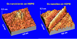 Atom lithography comprises a physical method where the trajectories of the atoms of an atomic beam are manipulated by means of interfering laser beams. In this way, atom lithography patterns a beam of atoms with a mask made of light leading to the fabrication of nanometer-scale structures. The NANOCOLD project aimed at the development of nanotechnologies based on the deposition of atoms focused by laser light, with an ultimate goal the fabrication of basic elements relevant for electronics, optoelectronics and information technology applications. In the context of the NANOCOLD project, nanostructures were grown onto a surface through the direct deposition of cold Caesium atoms. The cooling of an atom refers to the phase where an atom moving into the beam scatters many more photons than an atom moving away from the beam. This can happen by adjusting the frequency of the beam so that the net effect is to reduce the speed of the atom and thus cool it. The cold atomic beam of the apparatus is produced continuously out of a pyramidal magneto-optical trap (MOT) for Caesium atoms. The MOT is a specific configuration of mirrors mounted as a hollow pyramid, with a small apical aperture, in which the cooled atoms are confined to a small volume. Direct deposition of the cold Caesium atoms onto a surface was carried out, combined with in-situ microscopic diagnostics through Ultra High Vacuum (UHV) Scanning Tunnelling Microscopy. Highly Ordered Pyrolytic Graphite (HOPG) substrates, a relatively new form of high purity carbon, were used for the direct deposition of cold Caesium atoms in the presence of standing wave optical mask. However there has been difficulty in performing observation of a regular array of Caesium nanolines due to the relatively small dimensions of the atomistically flat regions of the substrate. Consequently efforts have been concentrated in the investigation of single, isolated lines, demonstrating remarkably good results. Caesium is highly reactive in air and its manipulation, deposition and investigation are very demanding. The project's outcomes enrich the knowledge and the relative literature of the specific diffusion used and growth phenomena met in the implemented regime. Further work must be done in order to clarify the role of process parameters and of substrate features in determining the shape of the deposits.