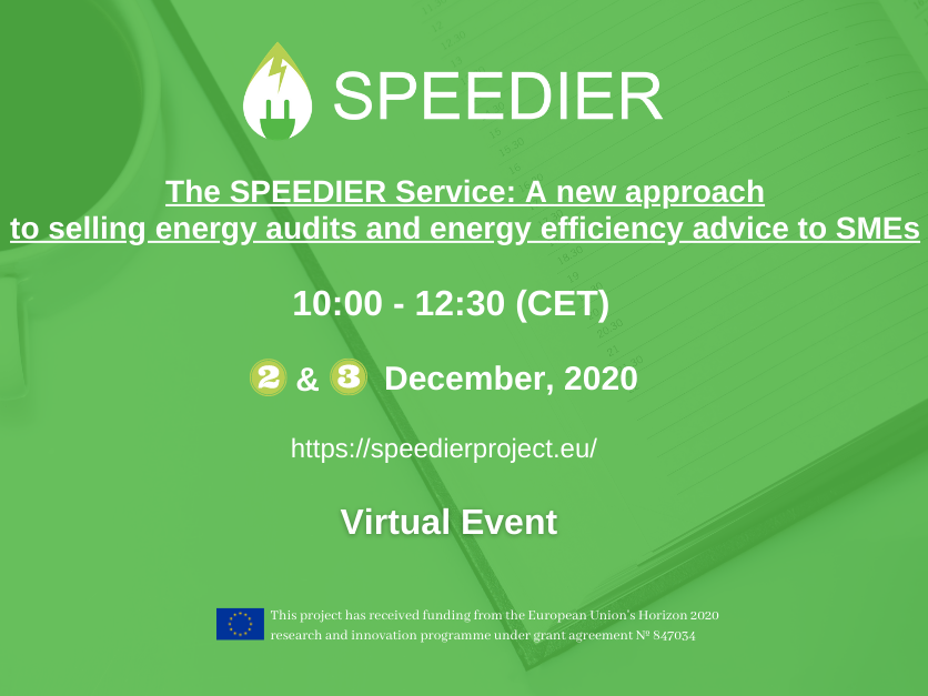 Over two half-day sessions, attendees will be introduced to the SPEEDIER Service and will learn about a new approach to persuading SMEs to undertake energy audits and implement energy efficiency measures. The different sessions will address the main barriers to the adoption of an energy culture and how they can be overcome. Likewise, SPEEDIER will present the innovative tools and techniques that the project is developing to assist energy experts to effectively engage SMEs in the energy transition and support them to perform energy assessments.