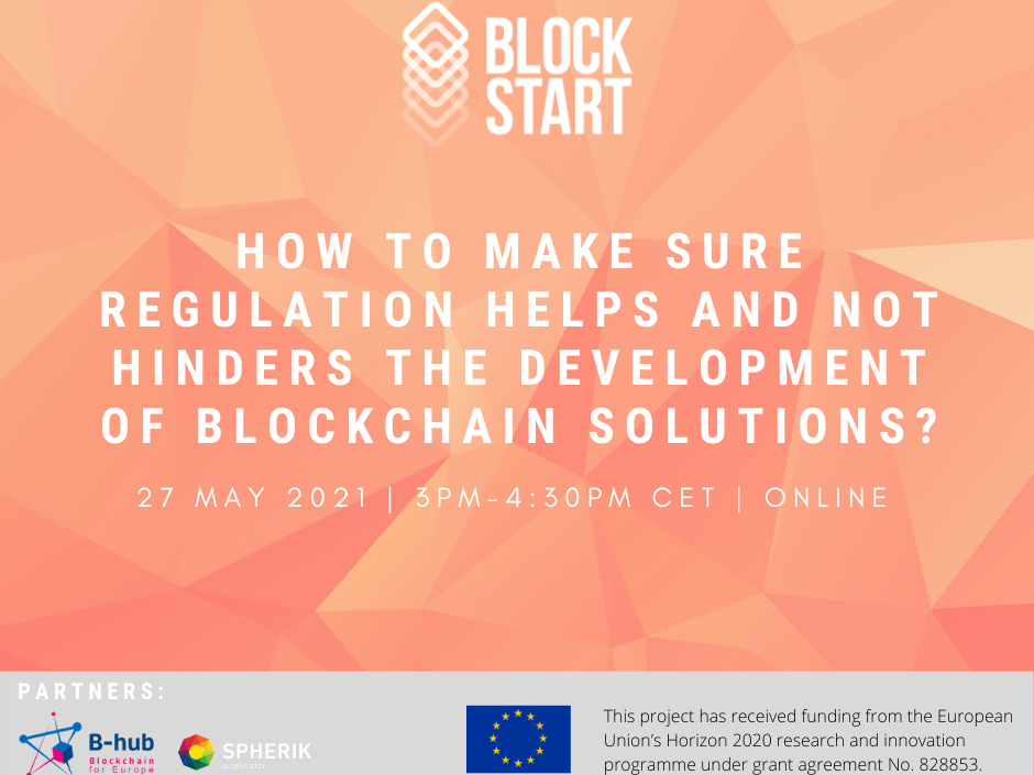Join BlockStart (https://www.blockstart.eu/(opens in new window)) on 27 May between 3pm-4:30pm CET for an online panel discussion, co-organized with B-Hub Blockchain for Europe project (https://b-hub.eu/news/(opens in new window)) and Spherik Accelerator (https://spherikaccelerator.com/(opens in new window)) – on blockchain technology regulation and find out from our invited experts – Sonia Sotero Muñíz, from New Technologies Department at Santander City Council, Johannes Mikkonen, Senior Policy Expert, Digital Governance at Demos Helsinki and expert at TOKEN project, Tudor Stanciu, Co-founder of Digital2Law and Arnoud Berghuis, Co-founder and Board member of the Dutch Blockchain Association, Blockchain Knowledge Foundation – what can help build the most appropriate regulatory framework which would support sustainable blockchain innovation. The panel discussion will be moderated by Vytautas Černiauskas, expert at CIVITTA.