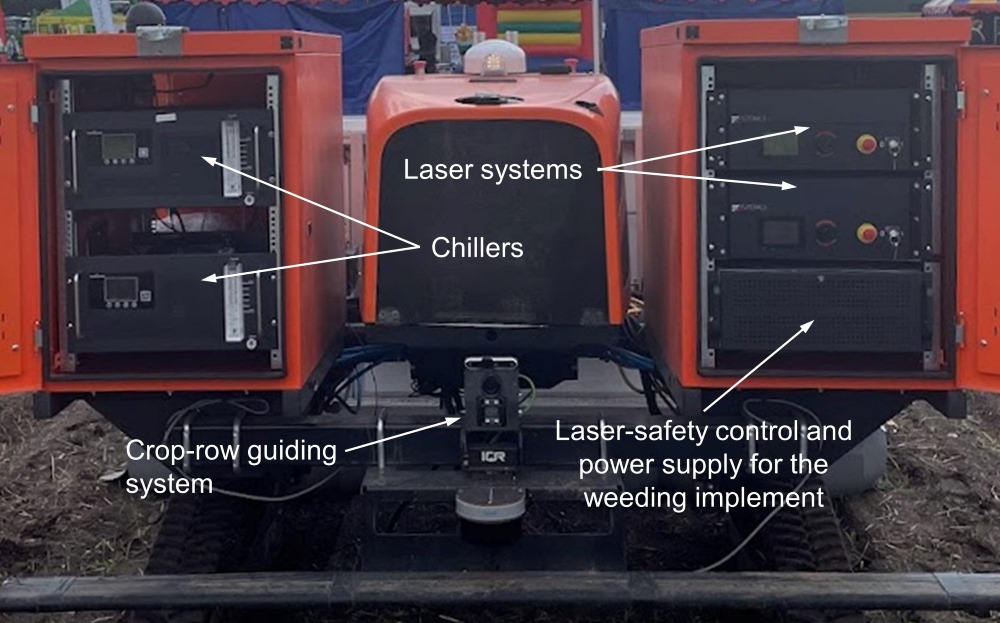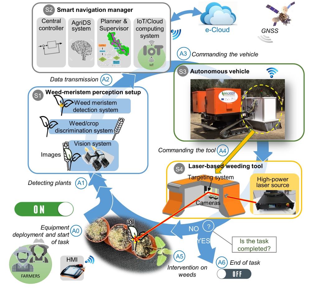 Concerned about these effects, the EU has promoted a decrease in herbicide use by seeking alternative solutions. Therefore, the WeLASER project focused on developing a weed management system based on applying lethal doses of energy to the weed meristems using 1) a high-power laser source, 2) an AI vision system, 3) a laser tool and 4) an autonomous vehicle based on smart navigation methods, IoT, and cloud-computing techniques.