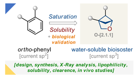 In this project, we want to (a) develop for the first time the saturated bioisosteres for ortho- and meta-substituted benzenes; (b) study their physichochemical characteristics (solubility, lipophilicity, metabolic stability); (c) incorporate the most promising cores into benzene-containing drugs and agrochemicals (Aceclofenac, Ketoprofen, Boscalid), and to study their biological activity and physico-chemical properties.