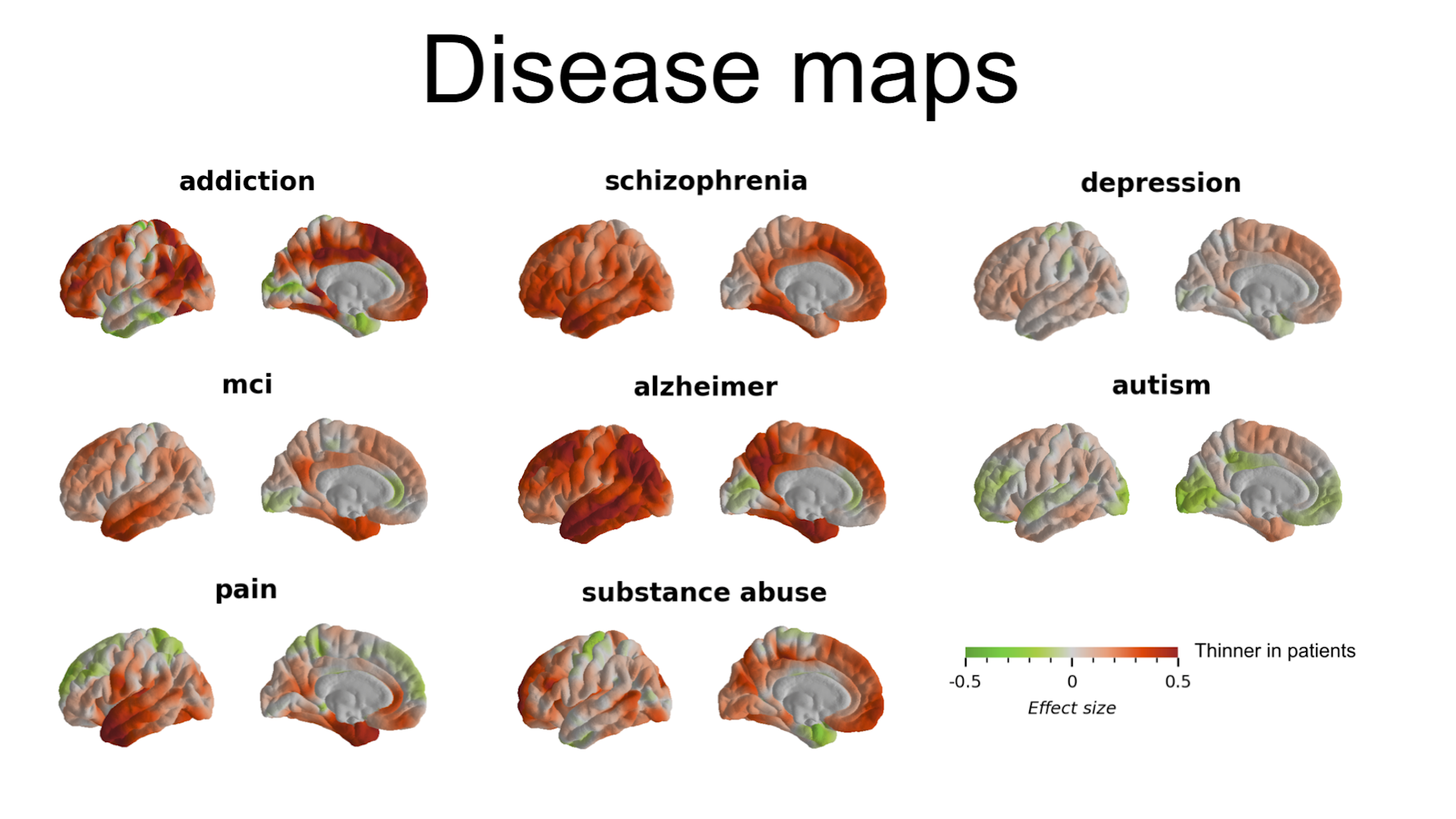 Disease maps (i.e. comprehensive representations of altered functional connections within the brain associated with various psychiatric and neurological conditions) derived from aggregated data and standardized analyses, have been computed for each disorder across three modalities: brain morphology, functional connectivity, and structural connectivity. These maps reveal patterns of both hypoconnectivity (reduced in disease) and hyperconnectivity (increased in disease) across disorders. As such, they now facilitate the exploration of both the overlap and heterogeneity in connectivity changes related to disease.