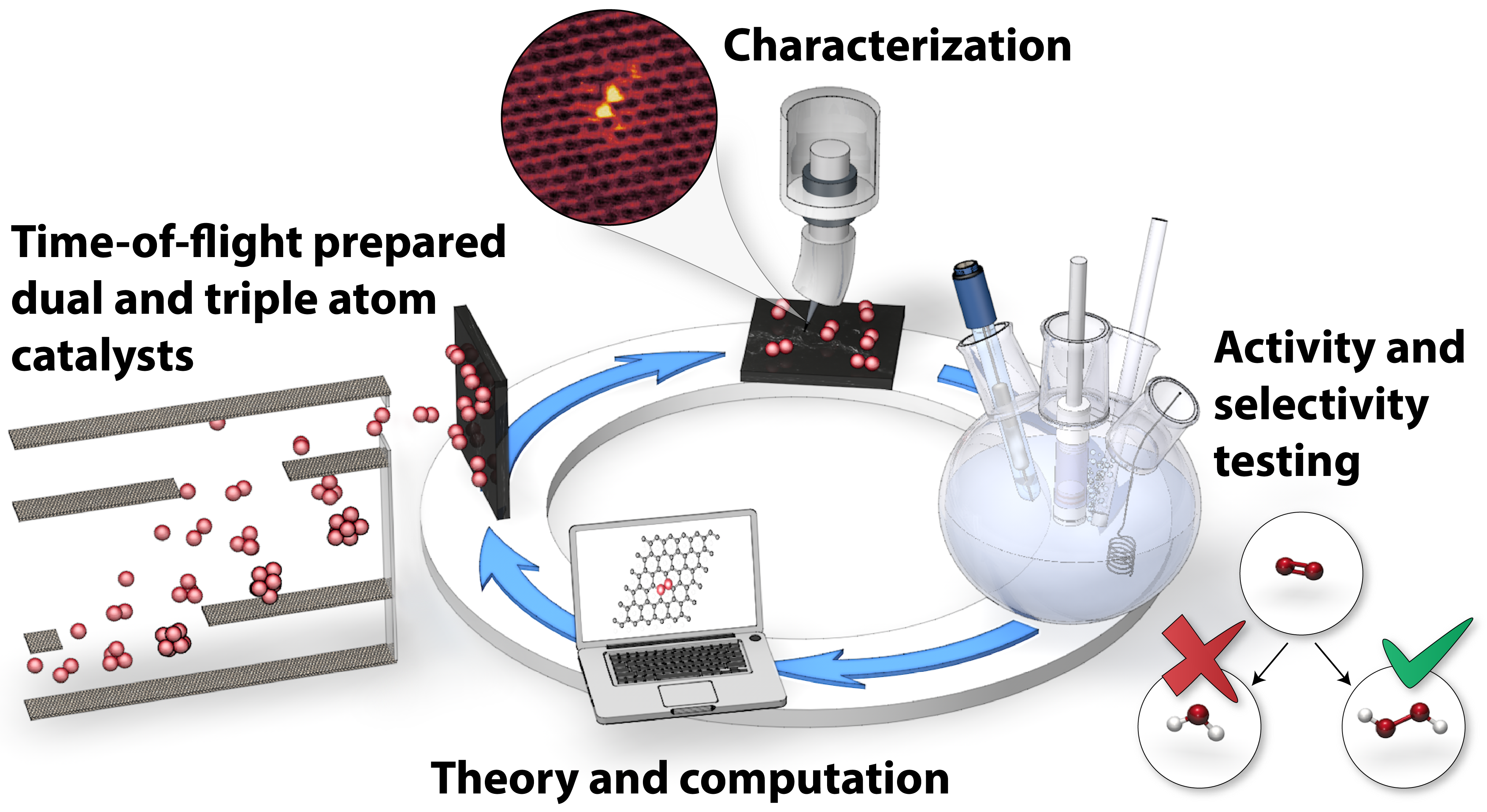 The project targets reactions such as electrochemical hydrogen peroxide formation, CO2 reduction to fuels and chemicals, and ammonia synthesis. The approach involves an iterative process that combines computation, synthesis, characterization, and activity testing. Dual and triple atom catalysts will be synthesized using a cluster source equipped with a time-of-flight-based mass filter. This method allows for controlled synthesis of dual and triple atom catalysts even bimetallic — an area that remains largely unexplored in catalysis. The resulting well-defined catalysts can be characterized at the atomic level, enabling direct comparison with computational predictions.