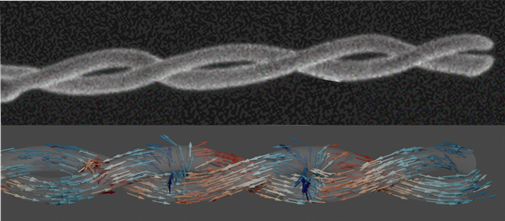 - Formation of topological magnetic fields across the whole space in double-helix DNA nanostructures. This constitutes the first work where thanks to 3D nano-patterning, such complex magnetic fields are created. This was possible thanks to our 3D nano-printing techniques, and state of the art X-ray tomograhic methods and magnetic simulations.