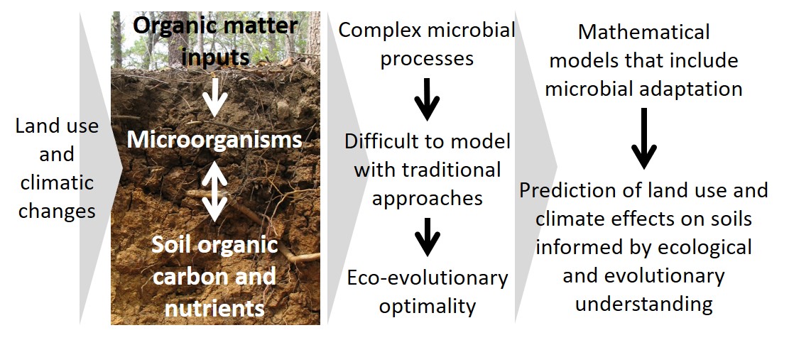 Our main objectives to answer this question are: i) determine how microorganisms adapt to varying resource and water availability in the soil and construct a new theory of microbial adaptation, ii) collect data from the scientific literature on microbial responses to soil amendments and variations in soil moisture, and create new databases with this data, iii) test the mathematical models of adaptation using the new databases and select the models that work best, and iv) assess impacts of land use and climatic changes on carbon and nutrient storage and fluxes using improved soil models that account for microbial adaptation based on the theory developed in objective i).
