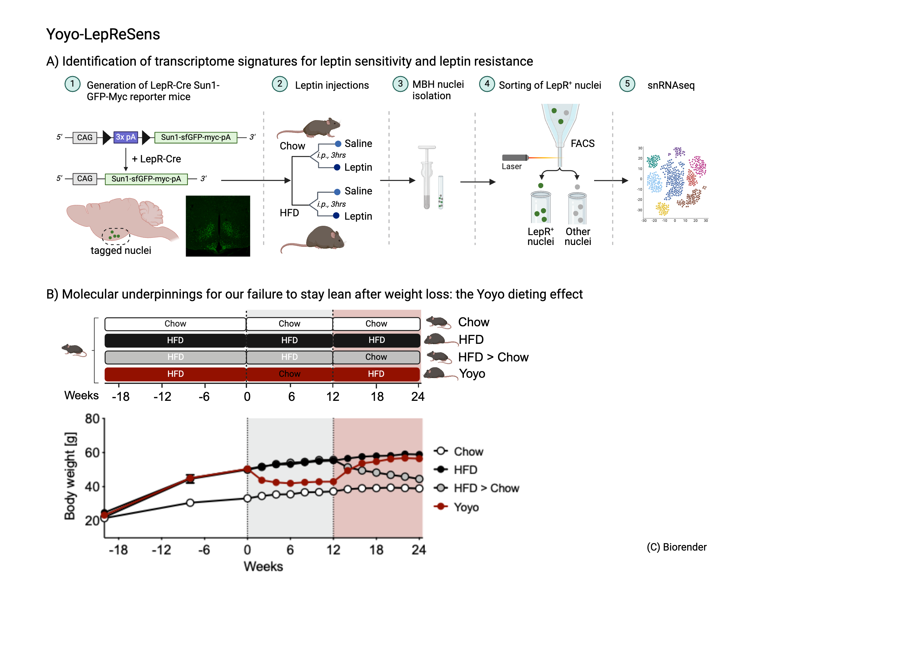 In the past, my lab explored the potential for therapeutic anti-obesity strategies built upon leptin action in the brain. Leptin is a satiety hormone produced by our fat tissue. The more fat we accumulate, the more leptin is secreted into circulation. Leptin then enters the brain and activates satiety in specific subpopulations of neurons that decrease our food intake and ultimately fat storage and body weight. In lean individuals, leptin is thereby a major contributor to appetite control and weight maintenance. In overweight and obese individuals, that weight regulatory function of leptin is lost due to a phenomenon called leptin resistance. In the grant proposal, we aim to delineate the molecular basis for that failure of leptin to decrease food intake and body weight. Specifically, we employ mouse models of obesity and weight loss and modern techniques to isolate specific subpopulations of neurons, and characterize how leptin, and small plant-derived molecules such as the leptin sensitizer celastrol, affect signalling pathways and transcriptional programs in these major areas of weight control. In the same brain areas and their respective neuronal subpopulations, we moreover aim to explore whether an epigenetic memory for obesity exists. Specifically, we aim to test whether diet induced obesity in mice can encode an epigenetic program in neurons that ultimately drives weight regain after dieting to reach the weight and fat mass the mouse once had. In sum, delineating the largely unexplored, brain-driven molecular events that impede sustainable weight loss and drive the Yoyo effect is a prerequisite for future therapies, and a major goal of my proposal.