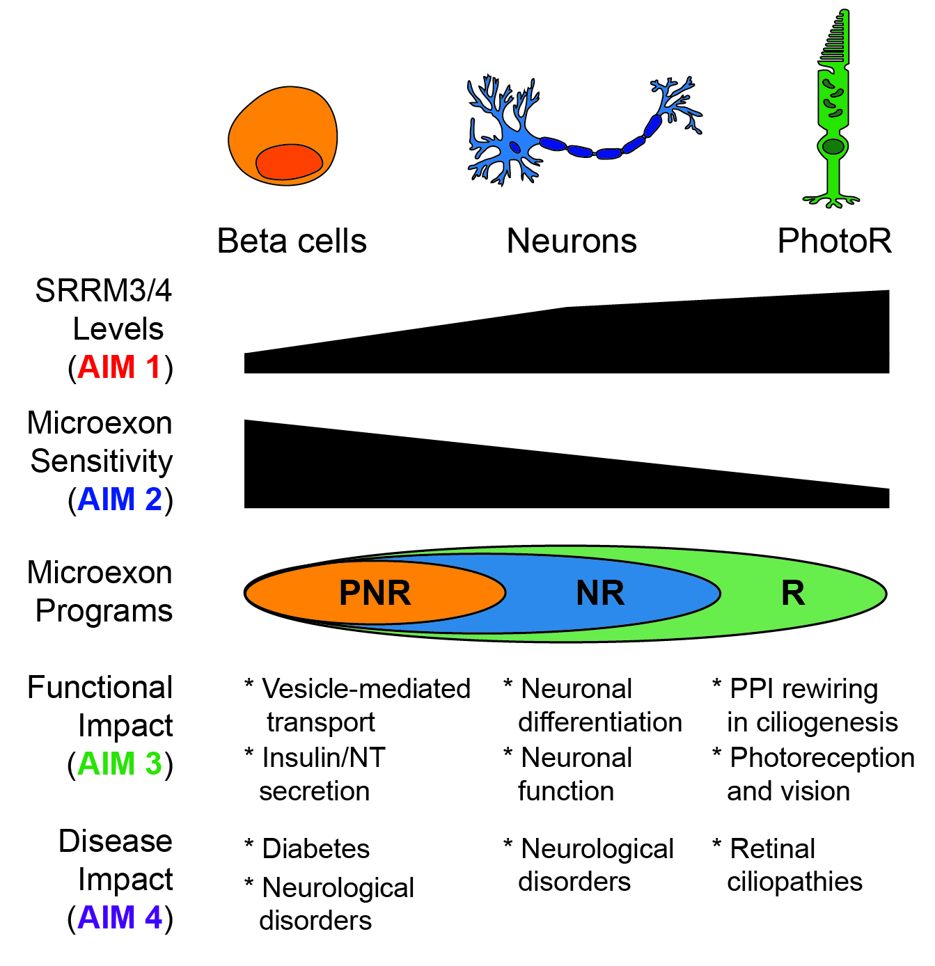 We expect to further elucidate the impact of microexons for endocrine pancreas and glucose homeostasis, neuronal differentiation and function, and photoreceptor development and vision. From these insights altogether, we will better understand how microexons, as a special type of genetic element, contribute to module tissue-specific proteomes. As recent progress, we have now generated a new model system (conditional Srrm3 KO mouse) that is providing insights into the nested microexon programs in a more precise manner. We are also delving into the metabolism of Srrm3 depleted cells.