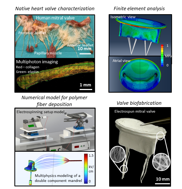 A key factor of innovation for BIOMITRAL fabrication process was the use of our patented double-component deposition technique (US20220039946A1) that allows for a controlled deposition of polymeric micro-fibers on intricate geometries by altering the collecting target surface conductivity. In order to advance this method, we coupled it with COMSOL Multiphysics modeling aiming to optimize the geometry of the collectors. We also established a multi-phase fabrication process, characterizing processing conditions for each of the phases to achieve desired thickness, microstructure, and mechanical properties. This paves the road to the integration of robotic with this processing methods. Similarly, the bioengineered chordae tendineae were fabricated using a mandrel-less deposition technique (US11680341B2), solvent welding strategies to connect valve leaflets with the chordae were evaluated during this reporting period.