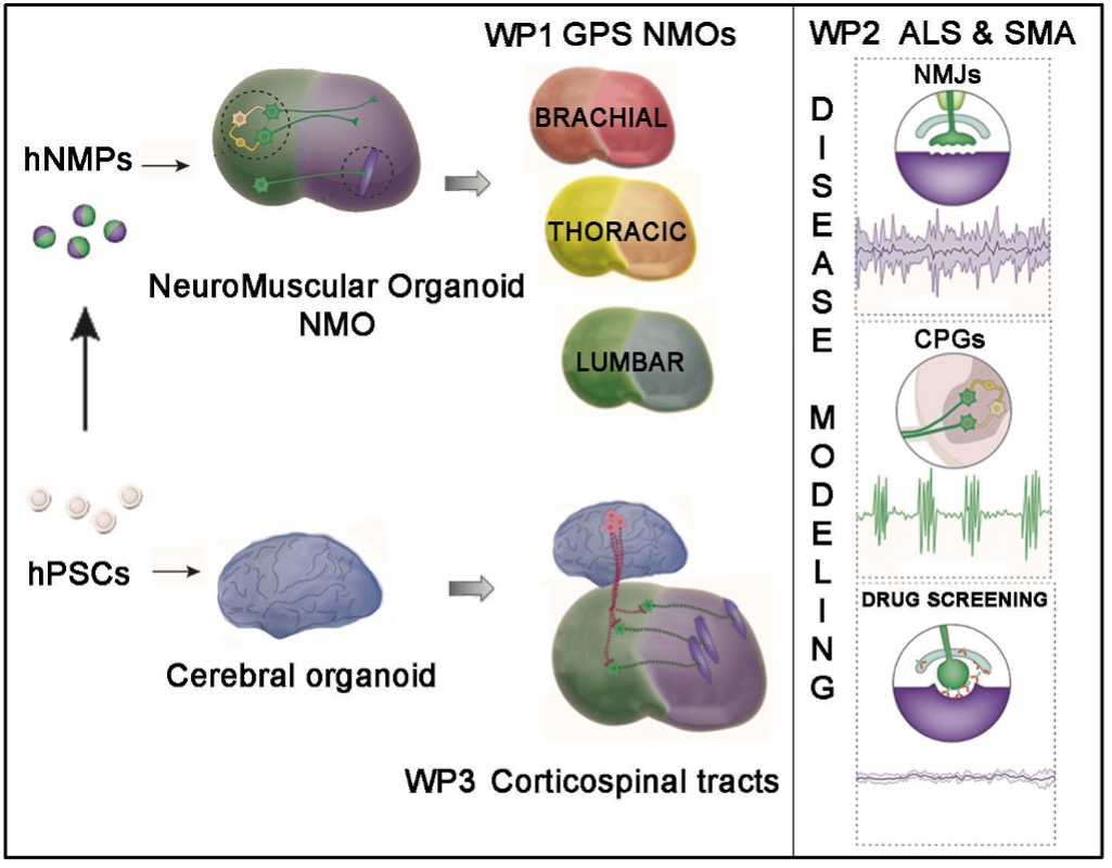 We have successfully generated neuromuscular organoids that correspond to anterior spinal cord levels. These organoids are currently being characterized in a manuscript that is in preparation. Additionally, we have established a sophisticated, self-organizing 2D neuromuscular junction model that corresponds to the brachial spinal cord levels. This work has been recently published by Urzi et al. in Nature Communications (2023).