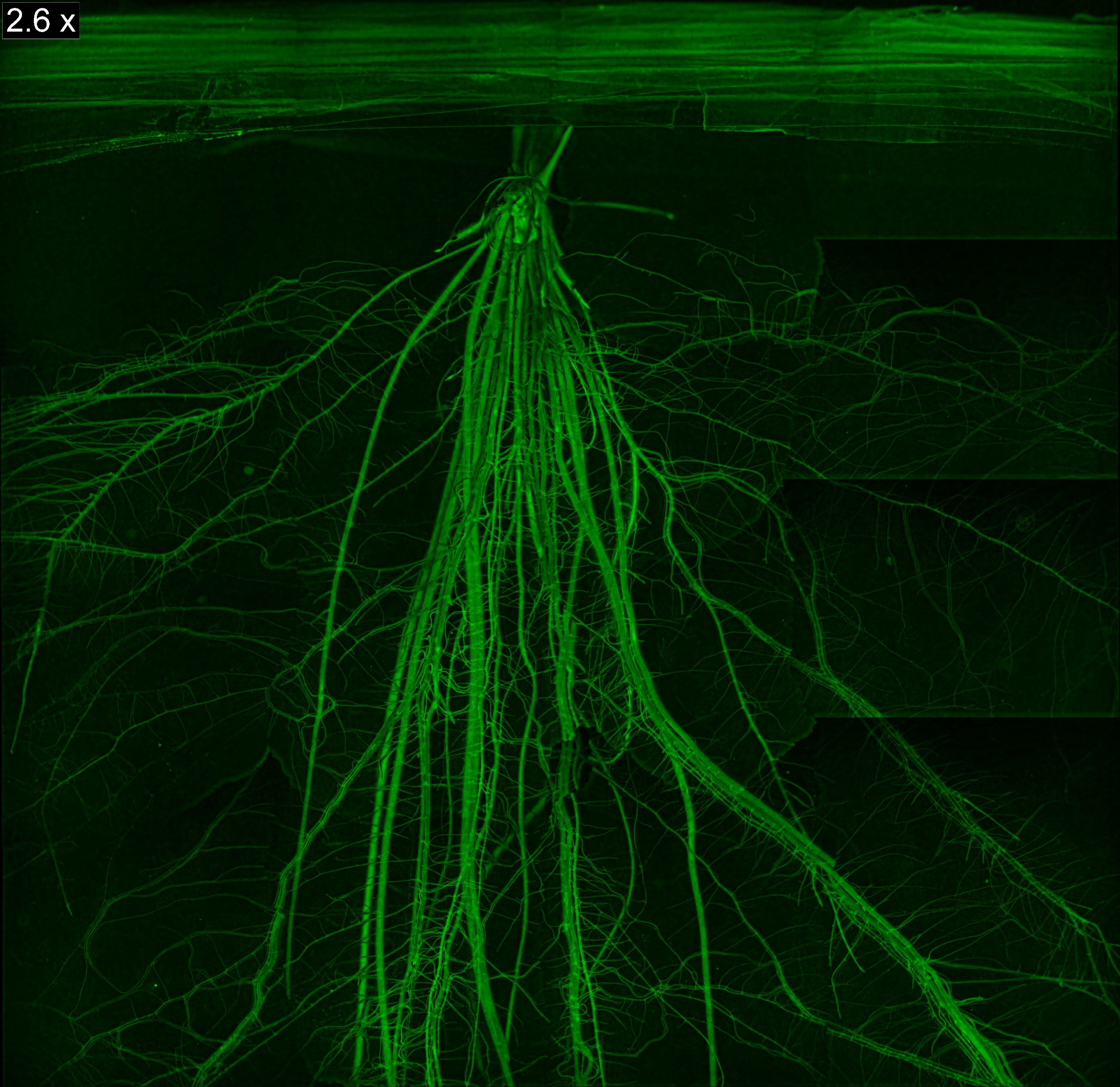 A stitching image from the microscope of the Oryza sativa root system apparatus under observation