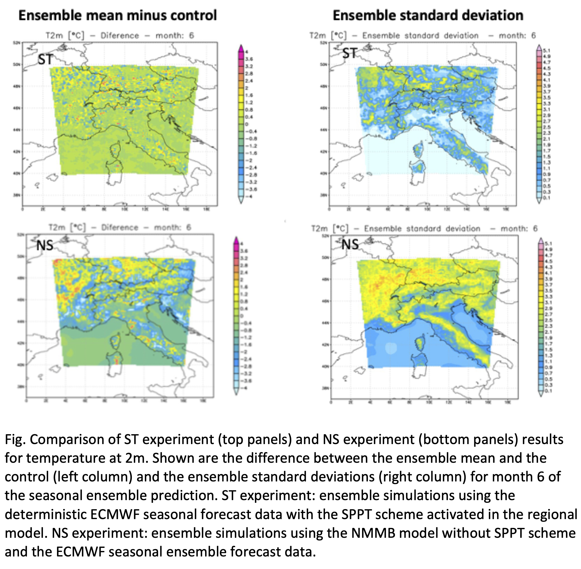 The first objective was addressed by implementing the SPPT scheme in the Nonhydrostatic Multiscale Model on B-grid (NMMB model) provided by the Faculty of Physics University in Belgrade (FPUB) and performing the ensemble sensitivity experiments at the seasonal climate time scales. This model was used for the dynamical downscaling of the ECMWF's SEAS5 seasonal forecast. The second objective was addressed by investigating sensitivity of cloud and precipitation microphysics parameterization to different configurations of the SPP scheme informed by results of nonlinear estimation of parameter distributions using microphysics-sensitive simulated satellite observations.