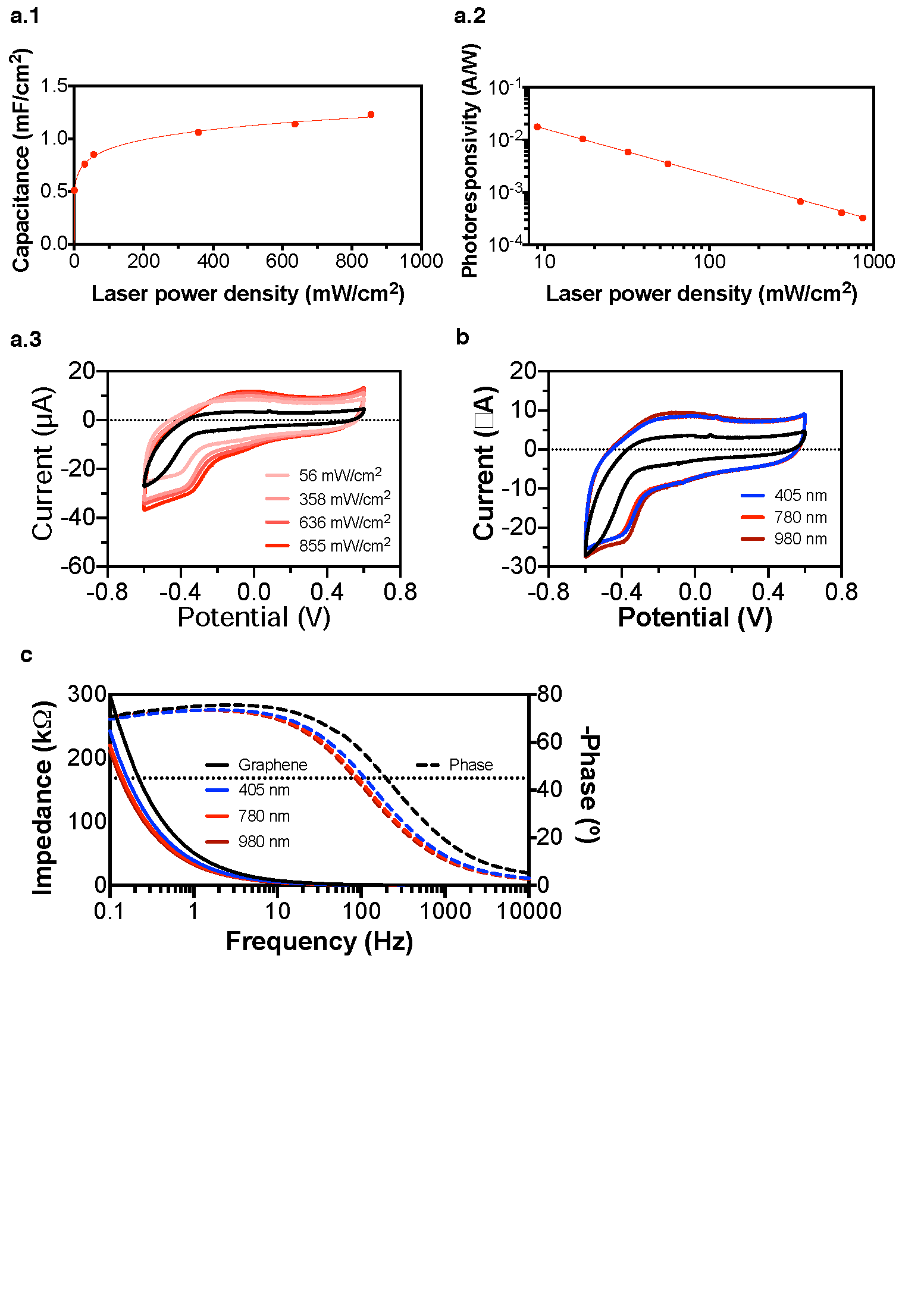 Non-genetic, light-mediated stimulation could offer a promising alternative to transform the treatment of neurological disorders and promote brain tissue regeneration. In order to realise that, biointerfaces need to be designed with flexible materials with low electrochemical impedance, in order to minimise electrode degradation and tissue damage. Graphene is an ideal candidate for this application because not only fits these requirements but also electrically responds to light. However, in order to develop minimally invasive devices, the use of tissue-penetrating near-infrared (NIR) radiation may be limited by graphene’s capability of converting it to heat.