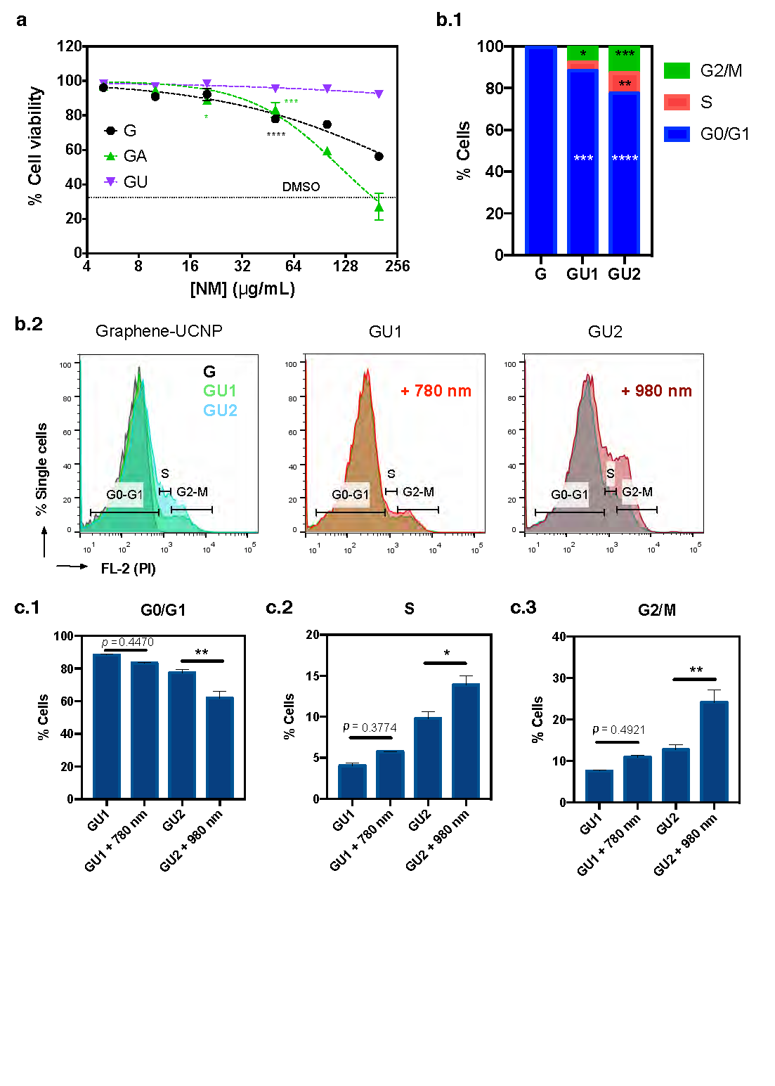 Finally, the biological impact of these nanocomposites was investigated in the presence of NIR radiation (Figure 3). Conjugation of UCNPs to graphene (GU) resulted in a biocompatible material with minimal cytotoxicity and oxidative stress, irrespective of their activation with NIR radiation (980 nm, 100 mW/cm2). SH-5YSY human neuroblastoma cells were used as a model to interface with graphene-based substrates prepared by spray coating onto PET films. Conjugation of graphene with UCNPs significantly increased the number of mitotic cells, evidencing increased cell proliferation (Figure 3). Interestingly, this effect was further enhanced by NIR radiation at 980 nm but not at 780 nm. Immunocytochemical analysis showed that glial and neuronal markers (e.g. GFAP, DCX) decreased with exposure to NIR radiation. Future work will investigate what (de)differentiation mechanisms might be activated, in order to better understand the mechanisms behind neurostimulation.