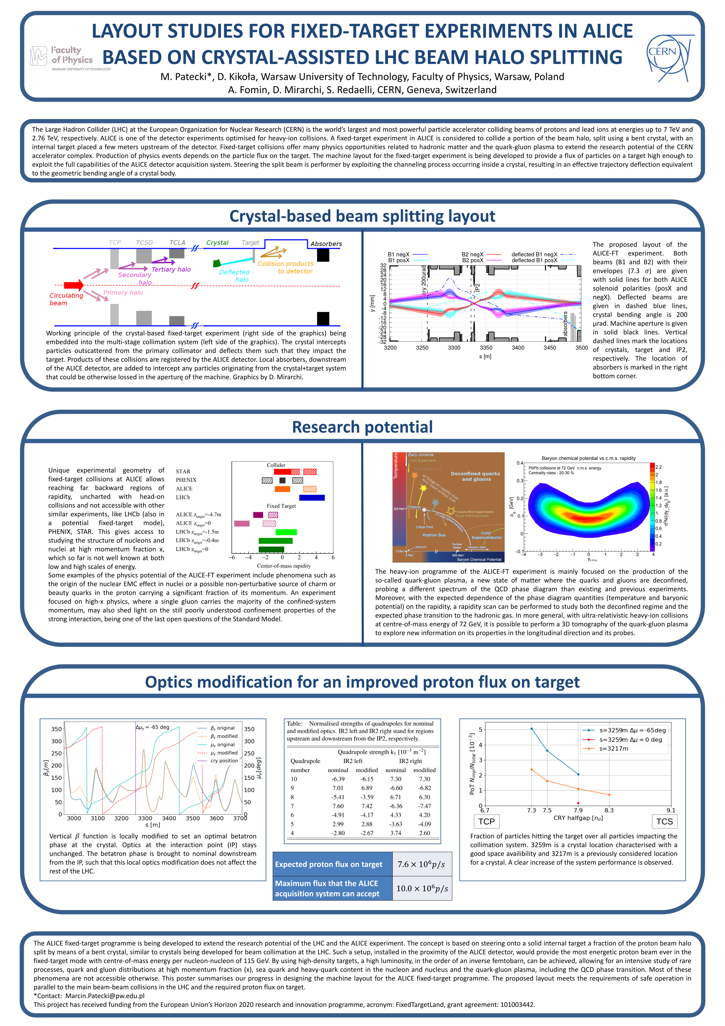 The general research objective of the project is to perform a feasibility study of the dedicated machine layout that would allow for the fixed-target programme at ALICE (ALICE-FT). The concept is based on steering onto a solid internal target a fraction of the beam halo split by bent crystals, similar to crystals being developed for beam collimation in the LHC. Splitting the beam is performed by exploiting the channelling process occurring inside a bent crystal, resulting in a trajectory deflection equivalent to the geometric bending angle of a crystal body. The problem to address was to design the machine layout that provides a number of protons on target high enough to exploit the full capabilities of the ALICE detector acquisition system without affecting the LHC availability for regular beam-beam collisions.