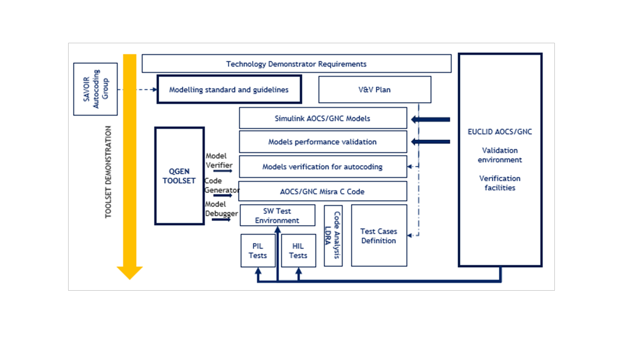 AURORA also provides the definition of an Autocoded Flight Software Life-cycle process based on QGen. The workflow and standards involved in the Model-in-the-loop process were defined, supported by AURORA modelling guidelines and the definition of the Models Unitary Integration and performance test campaign. QGen Simulation Framework code was ported to run on TSIM/Leon2 allowing us to perform the Platform-in-the-loop test campaign and finally, the Hardware-in-the-loop phase executed on EUCLID Software Validation Facility in which the autogenerated QGen code is integrated with the version 2.1.6 of AASW to run selected tests to check code behavior in a representative scenario.