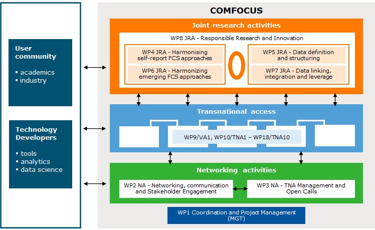 3) Virtual and Transnational Access (VA/TNA) – these activities, in the form of Open Calls, introduced (early career) researchers to a “new way of working” and provided them the opportunity to build and expand their network and to have access to other research groups and facilities, while they also contributed data as ‘proofs of principle’ to further build the COMFOCUS Knowledge platform. Researchers got access to 10 different key European infrastructures (including an Easy Questionnaire Tool, reconstructed/virtual reality, eye tracking, heart rate, galvanic skin response, electro encephalography and face reader). Promotion and dissemination of COMFOCUS outcomes and VA/TNA was supported by the Stakeholder Forum and International Advisory Board.