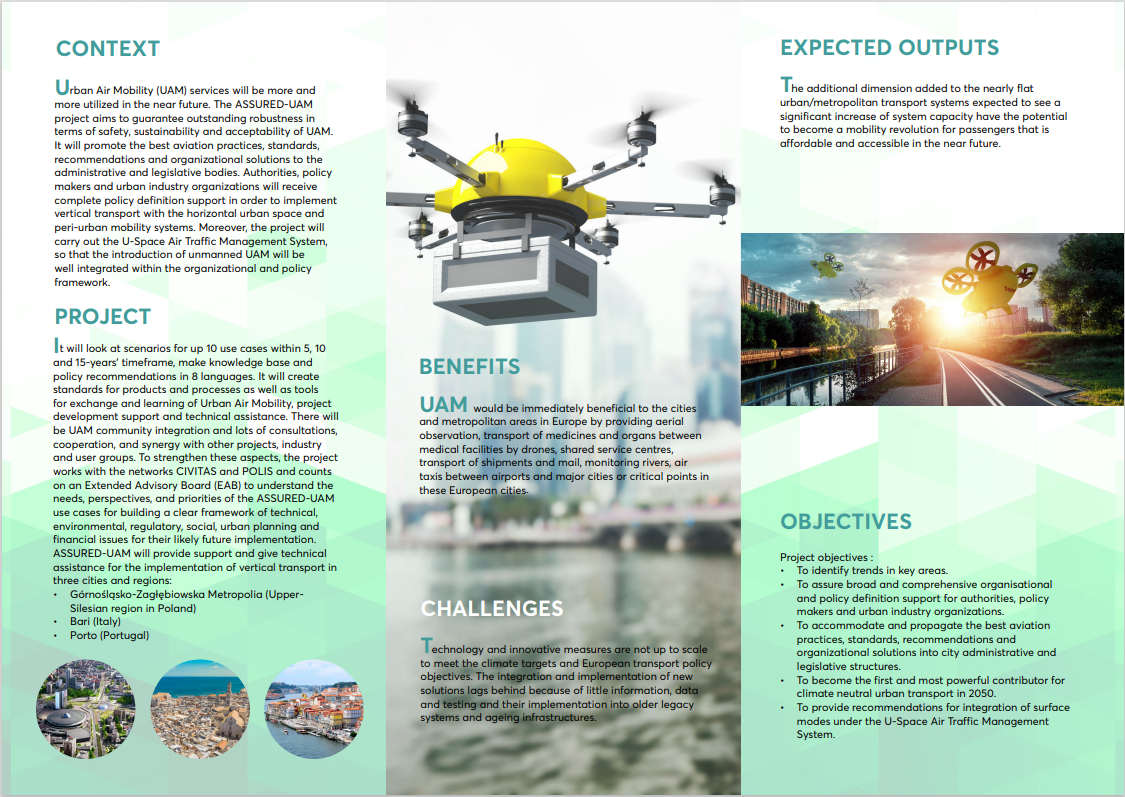 ASSURED-UAM provided support and gave technical assistance for the implementation of vertical transport in three cities: Górnoslasko-Zagłebiowska Metropolia, Bari (Italy), and Porto (Portugal). In parallel, all the procedures and tools for project management were established, as well as for communication and dissemination. The guides and video lessons addressing the process of efficient implementation of Urban Air Mobility were published.