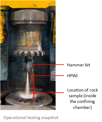 In conclusion, a prototype combining the DTH hammer and an intensifier was developed and tested in the laboratory environment under representative drilling conditions. The optimized drilling bit profile and jetting configuration for improved rock breaking efficiency through impact and HPWJ has improved the drilling rate by at least 4 times while tested using hard crystalline granites like Sidobre. The project demonstrated that the developed technology has its potential in improving the drilling rate in geothermal wells and thus result in significant cost reduction in its development to scale geothermal as a viable energy source.