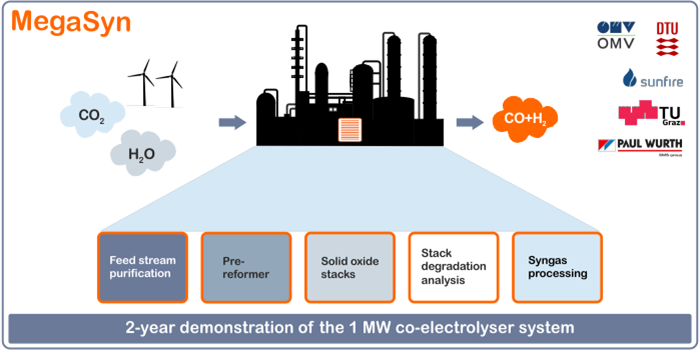 MegaSyn aims at the installation and integration of the world’s first co-electrolyser system in the megawatt-scale (MW scale) at the Schwechat Refinery, Austria. The project will upscale Sunfire's well-proven SOEC technology comprising an electrolysis system with a syngas production capacity of ≥ 80 kgsyngas/h using an electrical input of 0.7 MWel,AC. Detailed degradation studies will pave the way for determining the “safe operating window” for co-electrolyser systems for which degradation below 1.2 %/kh and a system availability above 95 % can be ensured – both essential targets for demonstrating the reliability of the co-SOEC technology. With Sunfire’s modular co-electrolyser concept and the planned integration scheme using steam and CO2 from the refinery, and potentially using recycle gases, the system is far simpler than competing PtX processes. Furthermore, the operation costs are low due to the high electrical efficiency of the SOEC. If succeeded, the MegaSyn project will thus demonstrate an up-scalable and integrable solution for refineries for substituting fossil based routes for fuel production. The concept of the MegaSyn project and its product – syngas – will likewise be valuable and possible to integrate in the (petro-) chemical industry. The project will strongly benefit the competitive position of key European industries in the emerging and rapidly growing world market for green energy technology. Providing the targeted industrial landmark will likely further improve societal acceptance and give additional momentum to the energy transition.