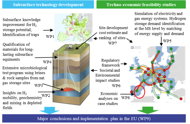 Complementarily, techno-economic feasibility studies are providing insights into underground hydrogen storage for decision makers in government and industry. Modelling of the European energy system will first define the demand for hydrogen storage. Environmental and Societal impact studies will be developed. For a given location and hydrogen storage demand, a high-level cost assessment for development of each of the competing geological storage options at that location will be estimated, and the sites will be ranked based on techno-economic criteria developed within the project. Finally, several case studies will enable consideration of the implementation of potential projects, notably by considering their economic interest.