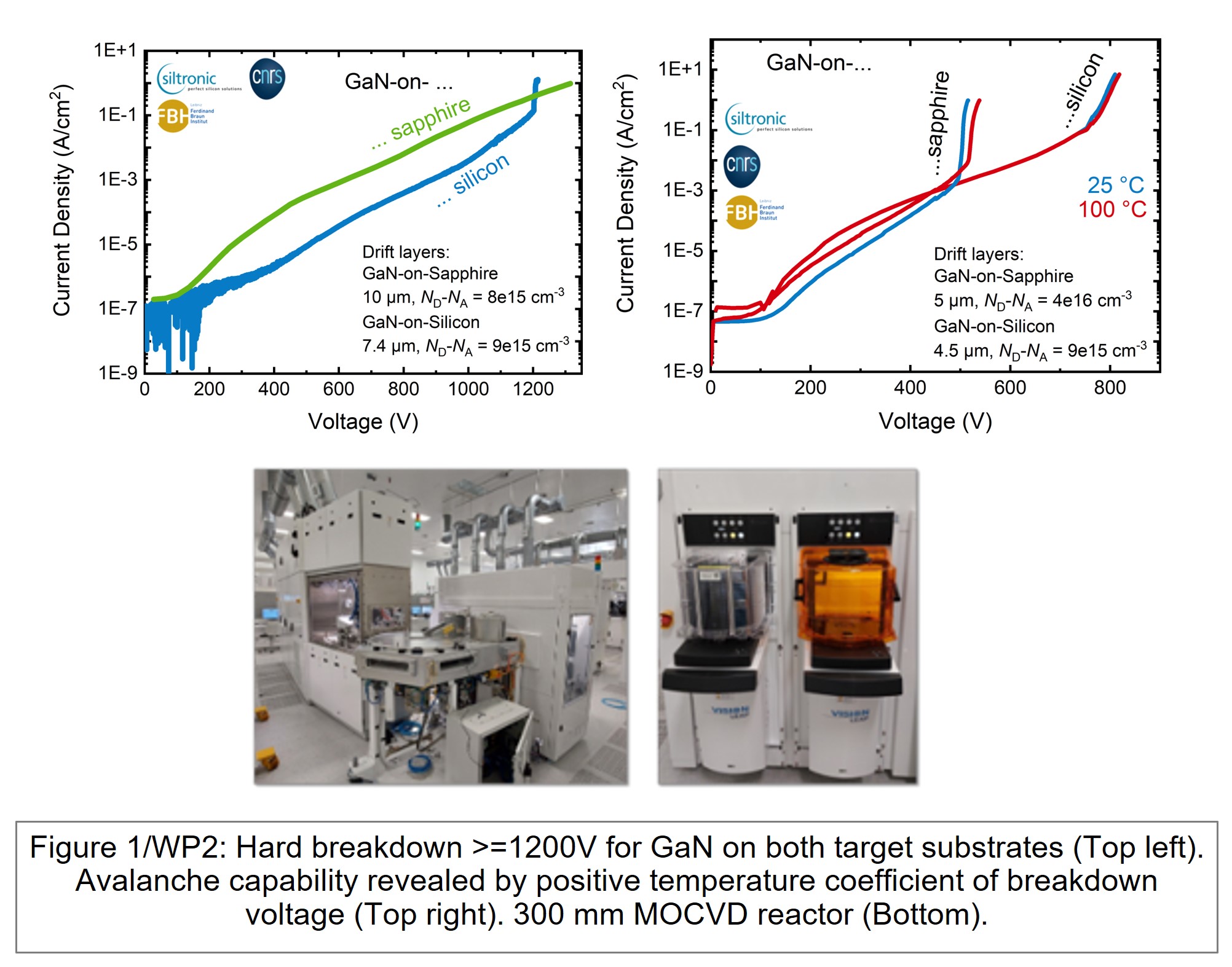 - Development of vertical drift epitaxy up to 1200 V blocking voltage on low-cost silicon or sapphire substrates up to 300 mm wafer size