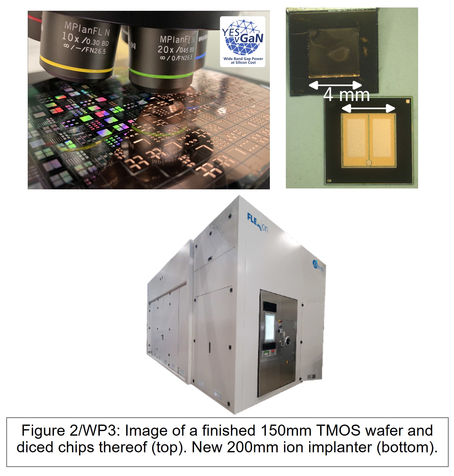 - Demonstration of the feasibility of running 200 mm GaN-on-Si wafers with vertical epitaxial stacks through a manufacturing line including an optimization of the source implant.