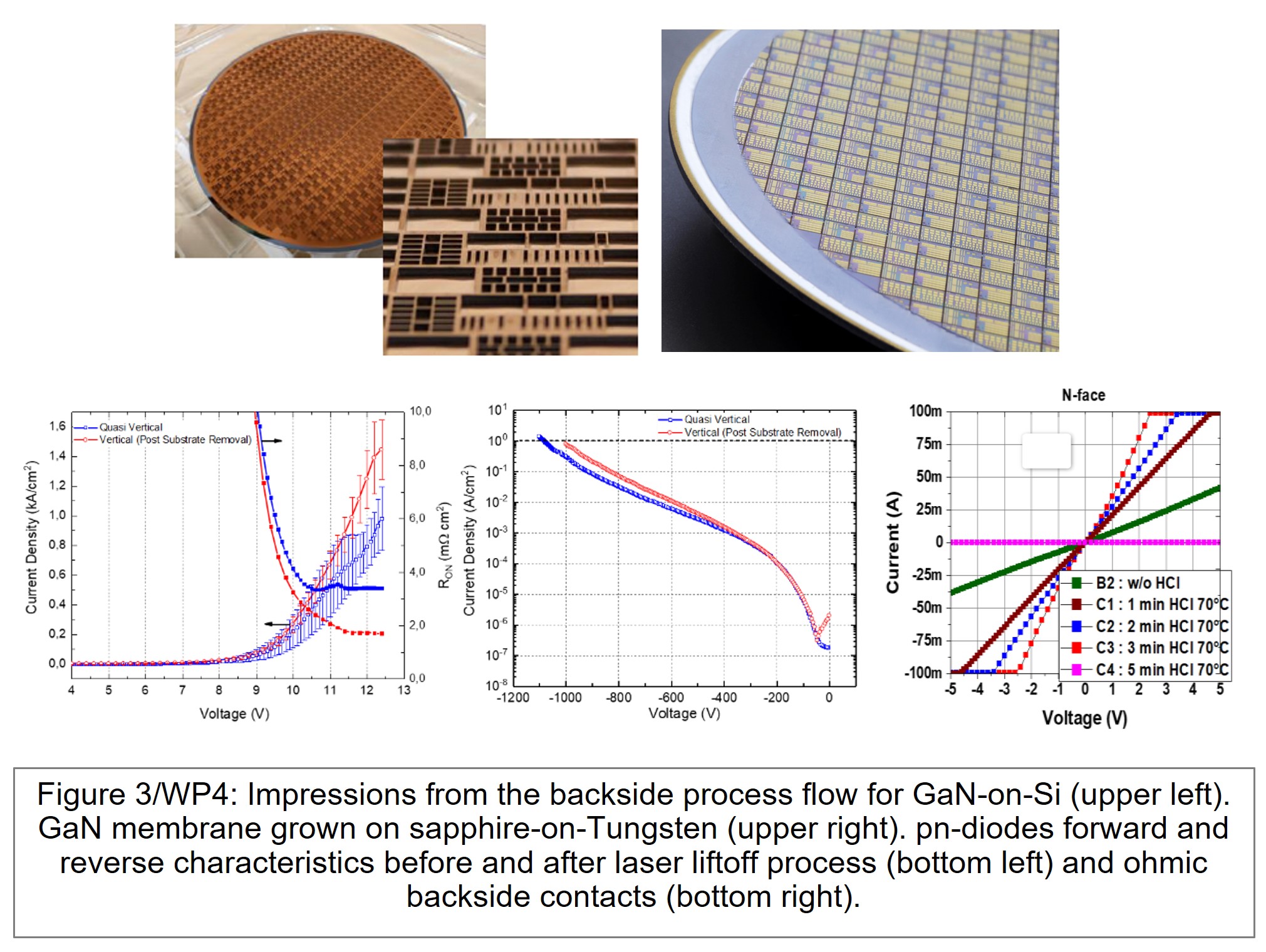 - Demonstration of full substrate removal by laser lift-off of 100mm GaN-on-sapphire wafers with processed pn-diodes and verification of vertical conductivity and blocking strength of 1000 V