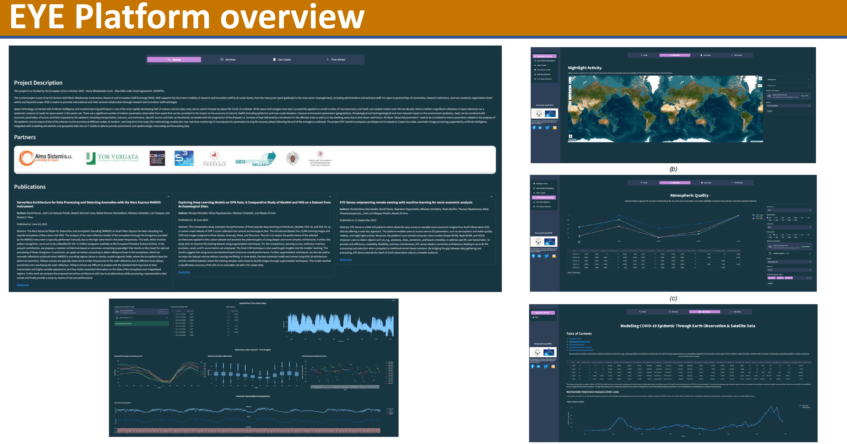 The EYE project main result includes the development of the EYE-SENSE platform through which local and public authorities will be able effortlessly gain access to Earth Observation (EO) parameters of a selected area related to atmospheric and water quality, night-light activity, land-surface temperature and object detection. Those EO parameters can be used to directly analyze a region’s socio-economic activity.