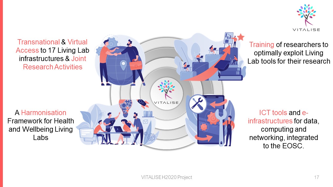 VITALISE opens up Living Lab research infrastructures as a means to facilitate and promote research activities in the Health and Wellbeing domain in Europe and beyond, by enabling in person Transnational Access to 17 Living Lab research infrastructures and by supporting remote digital access to datasets of rehabilitation, transitional care and everyday living environments through harmonised processes and common tools. VITALISE will design and develop ICT tools for shared access of similar devices and applications used across Living Labs. Lastly, VITALISE will invest in the development of training methods towards the wider understanding and valorisation of Living Lab methodologies in the research community.
