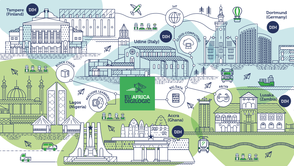 DIGILOGIC is centered on five DIHs: three DIHs in Europe (GER, FI, IT) and two DIHs in Africa (GH, ZA), reaching nine countries (GH, NG, ZM, ZA, KE, MW, ZW, NA, MZ).