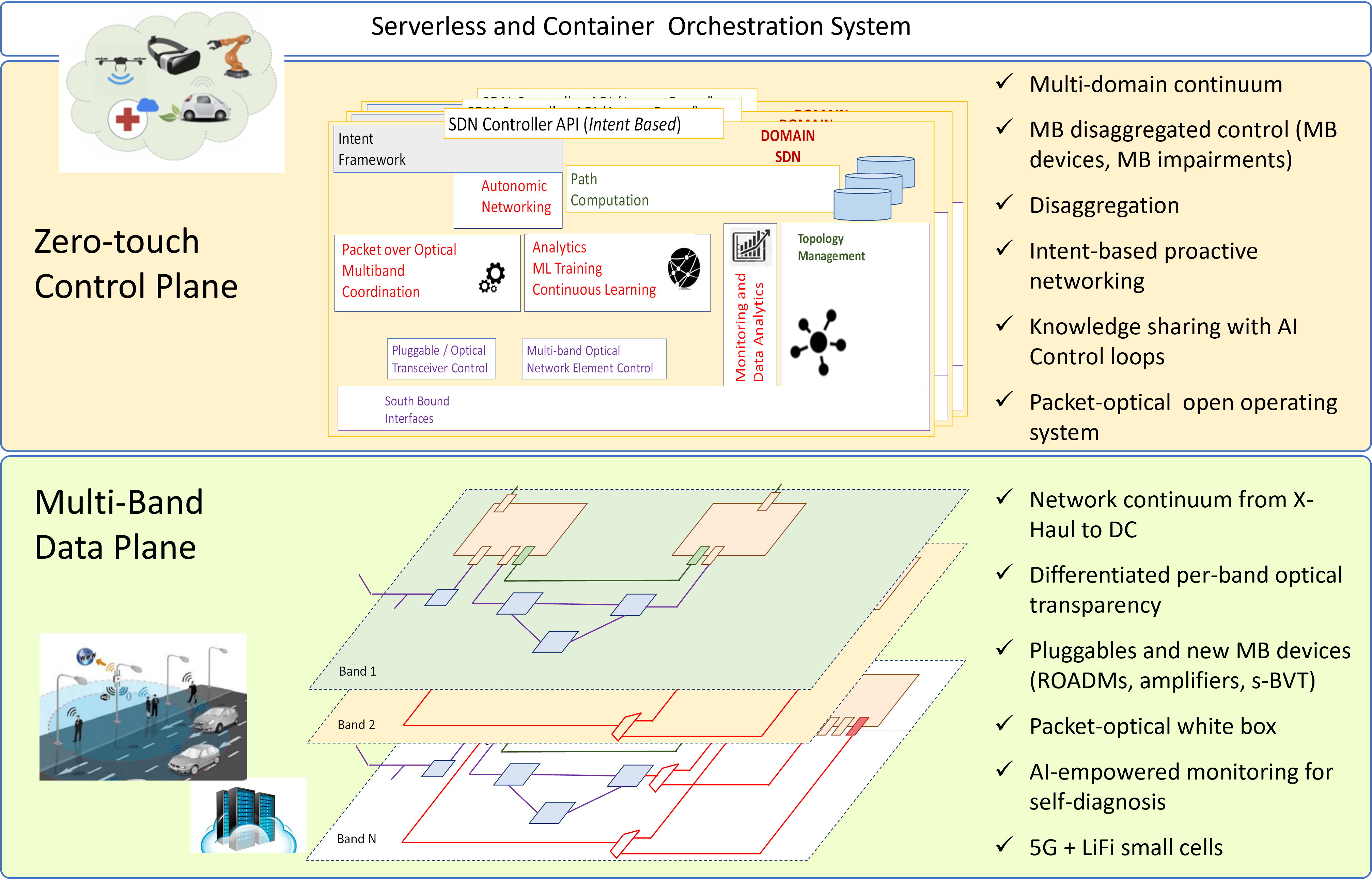 B5G-OPEN will also design and validate a novel MB optical access and X-haul infrastructure enabling massive small cell deployments based on: (i) MB (> 4 optical bands); (ii) heterogeneous PtP and PtMP services; (iii) power-efficient pluggable-based multi-technology; and (iv) an X-haul infrastructure that will enable the deployment of a massive WDM channel fixed-line connectivity, with technology-agnostic hybrid connectivity schemes in the last-drop, and supporting QoS-guaranteed services over both 5G and innovative Li-Fi access.