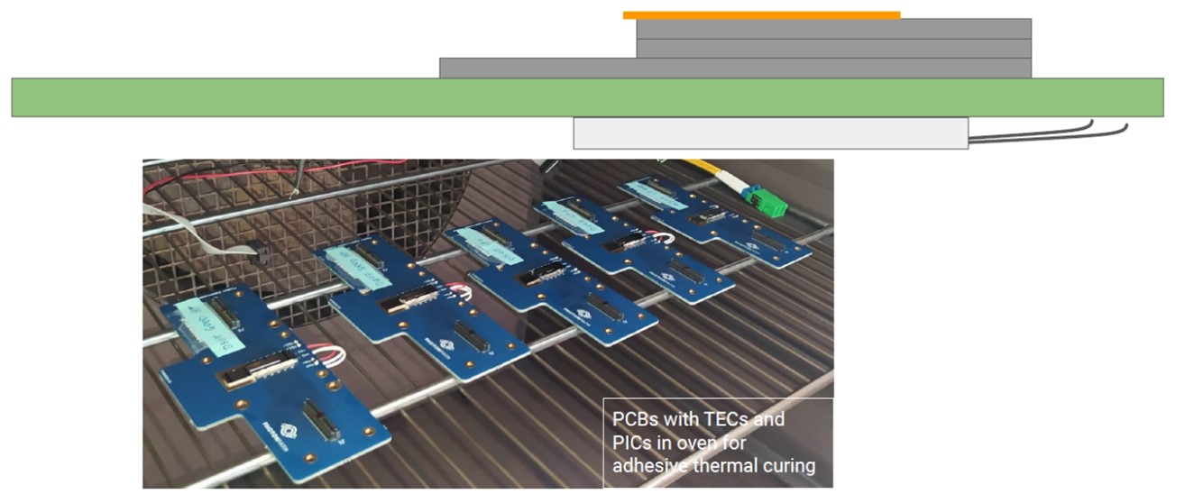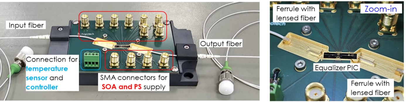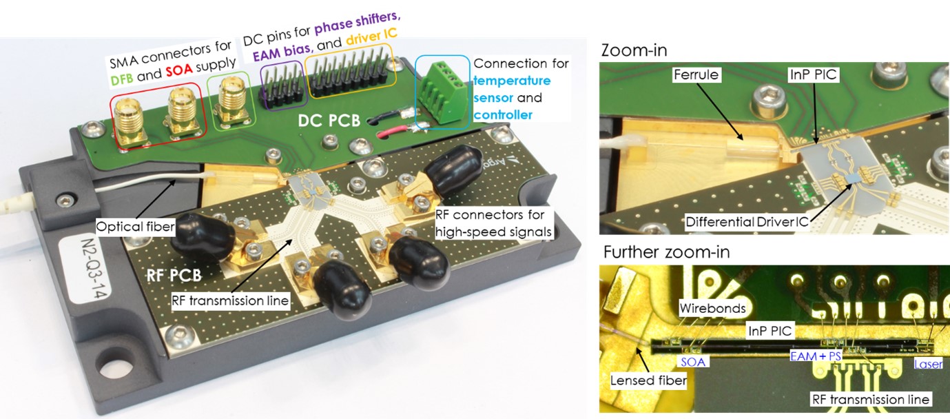 WP5: Key photonic circuits and advanced PIC demonstrators were developed and packaged, with requirements defined through mechanical, electrical, RF, thermal, and optical coupling simulations. Tx-side PICs included an all-optical pre-equalizer and an EAM-MZM, while Rx-side sub-demonstrators like polarization controllers and balanced photodetectors supported a single-polarization coherent receiver.