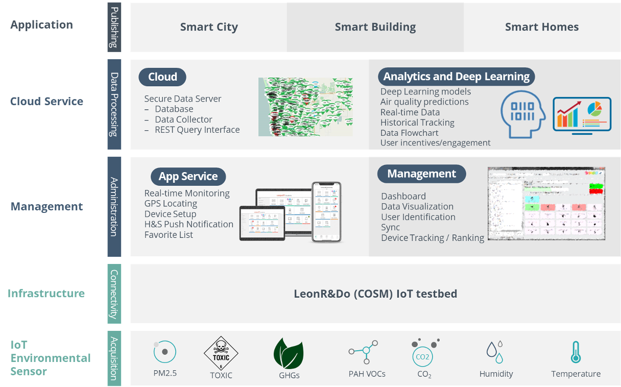 7. Leverage IoT testbed and demonstrate supporting IoT services, including air quality visualisation, real time health and safety security alerts, real time commands execution, and gamification