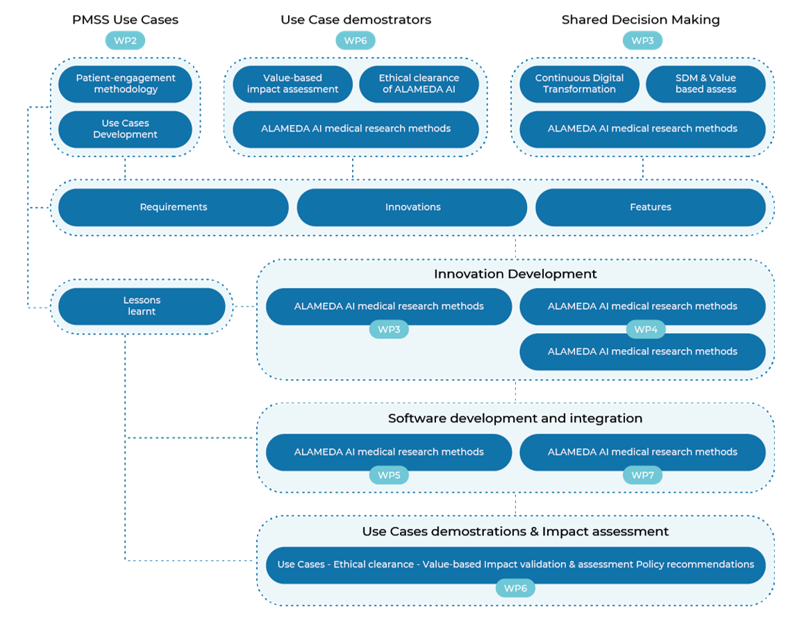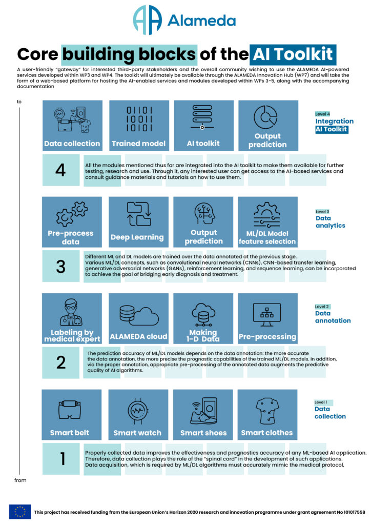 ALAMEDA's approach to tackle the challenge of evaluating and assessing the disease status of patients with either Multiple Sclerosis, Parkinsons Disease or Stroke is innovative and comprehensive. By bringing together the right technical and medical experts within a consortium, the project targeted in revolutionizing patients’ monitoring and disease progression with the overarching goal of enhancing patients' quality of life, while also medical experts are constantly aware of their status with enriched and unbiased insights. One key aspect of ALAMEDA's strategy is the utilization of digital technologies to gather rich diagnostic/evaluation data streams, capitalizing the expertise of clinical professionals to ensure the data collected is relevant and informative while being minimally intrusive in patients’ daily lives. The integration of the patient’s input on acceptability and usability in their daily lives, ALAMEDA ensures a holistic monitoring approach. ALAMEDA employs Big Data and AI methods to analyze the collected data streams, targeting disease progression assessment and provides personalized healthcare guidance. Outcome insights complement existing medical protocols and enable clinical practitioners to remotely monitor their patient in an unbiased and continuous way.