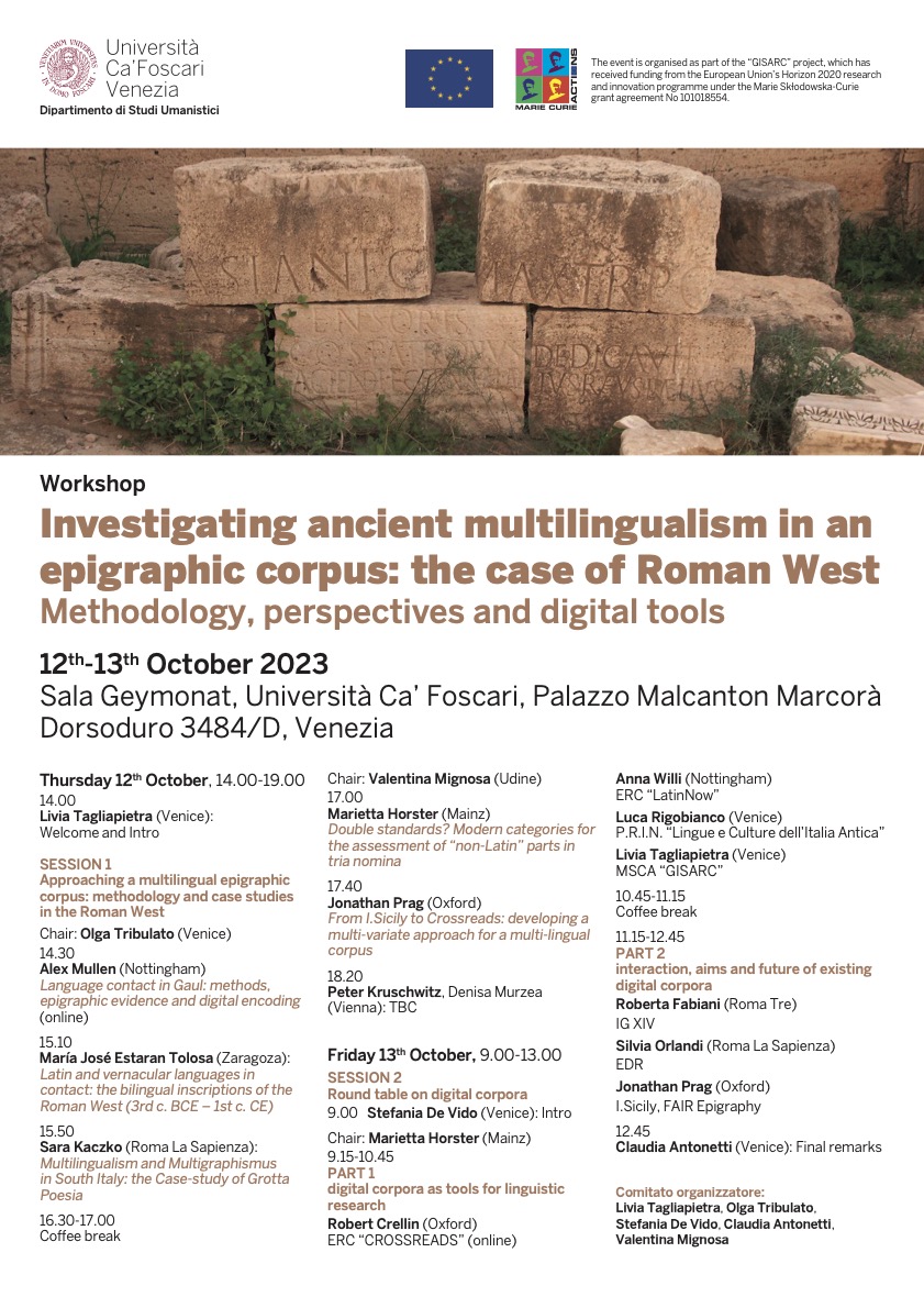 The project analysed over 2000 epigraphic texts dating between ca. 250 BCE and ca. 400 CE in relation to language contact, multilingualism, language choice and prestige, and epigraphic culture. On the basis of this analysis, patterns of language choice have been identified in relation to different contexts (typologies of text) as well as dynamics of language contact between Greek and Latin with regard to individual areas. An innovative open access, interactive and interoperable digital resource has been under development for the dissemination of the results of this analysis. As part of the project, an international workshop entitled “Investigating ancient multilingualism in an epigraphic corpus: the case of Roman West. Methodology, perspectives and digital tools", was held at Ca’ Foscari on 12th-13th October 2023, with the aim of promoting discussion and networking among linguists, historians, epigraphists and digital epigraphists on the topics of language contact in epigraphic corpora and digital corpora as research tools.