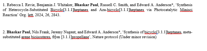 Update of the plan for exploitation and dissemination of results. One publication as a co-author (Org. Lett. 2024, 26, 284) was published on the ‘Synthesis of Heterocycle-Substituted Bicyclo[3.1.1]heptanes and Aza-bicyclo[3.1.1]heptanes via Photocatalytic Minisci Reaction’. A second paper as a first author is now under revision (minor) in the journal Nature Protocols on ‘Synthesis of bicyclo[3.1.1]heptanes meta-substituted arene bioisosteres, from [3.1.1]propellane’. Further work need to be done to explore the deuterium labelled and aryl substituted [1.1.1]propellane chemistry, and publications are anticipated. Throughout the Fellowship, the researcher was encouraged to participate in ongoing Outreach activities within the Chemistry Department, such as the Department Open Day, which includes tours of the various laboratories. The Host group also uses a Lay Summary (includes the topics of the Fellow's research) on the group website to provide comprehensible information on group research to the general public. These publications acknowledge EU funding including the specific grant code (101020227) of the Fellowship.