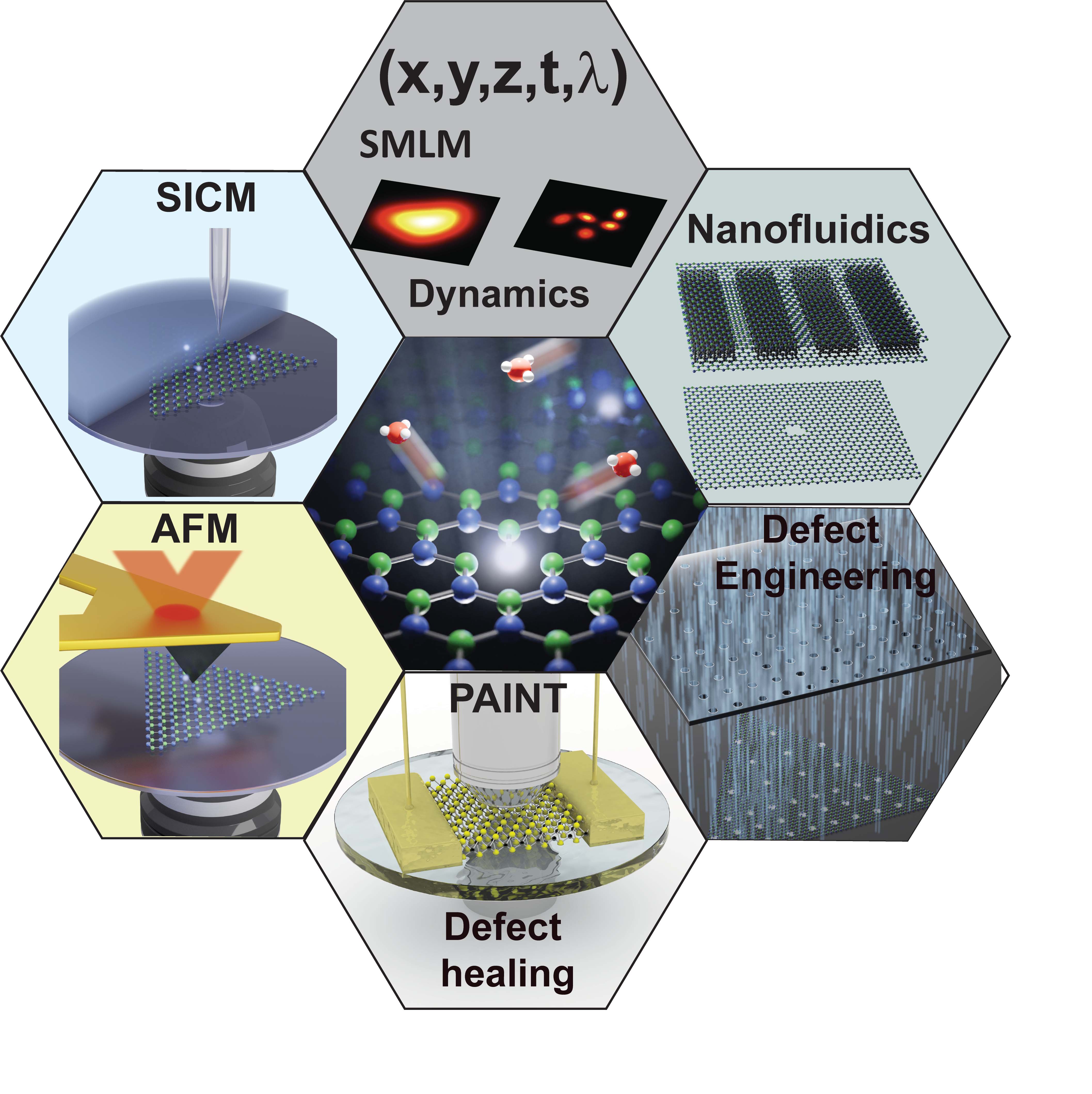 The main aim of the project was to focus on the characterization of Defects in 2D Materials: Explore defects in hexagonal boron nitride (h-BN) and transition metal dichalcogenides (TMDs). Through the project, we introduced various defects into native hBN using different methods. We employed focused ion beam irradiation to create defects and also used neutron irradiation, among other techniques, to control defect density and study their effects. In addition, we explored the interaction of the surface with various types of solvents and compared their behaviour under strong confinement. We used existing nanofluidic platforms and innovated new ones, such as mechano-ionic switches. Characterization and observations were often supplemented with in-operando microscopy. For the project, we developed or adapted several forefront nanoscopy methods, such as single-molecule localization microscopy (SMLM), single-particle tracking (SPT), PAINT, and scanning ion conductance microscopy (SICM), to study the dynamics of interfacial charges.