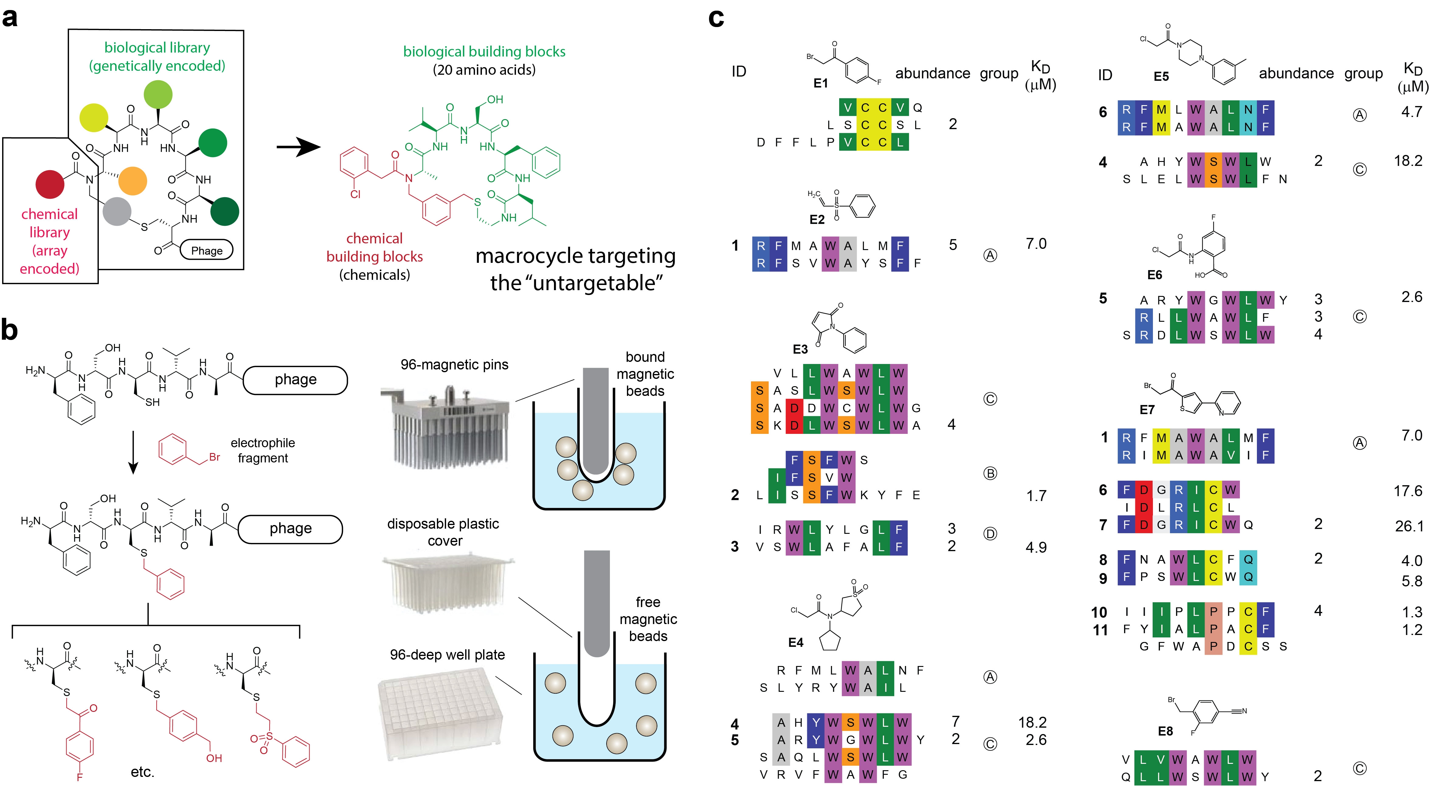 Initially, we explored alkyne-azide click reactions but found them inconsistent. We instead adopted thiol-based modifications, which proved robust for diverse electrophilic reagents. Using this approach, we constructed and screened peptide libraries with appended chemical fragments and validated the method on challenging protein targets such as MCL-1.