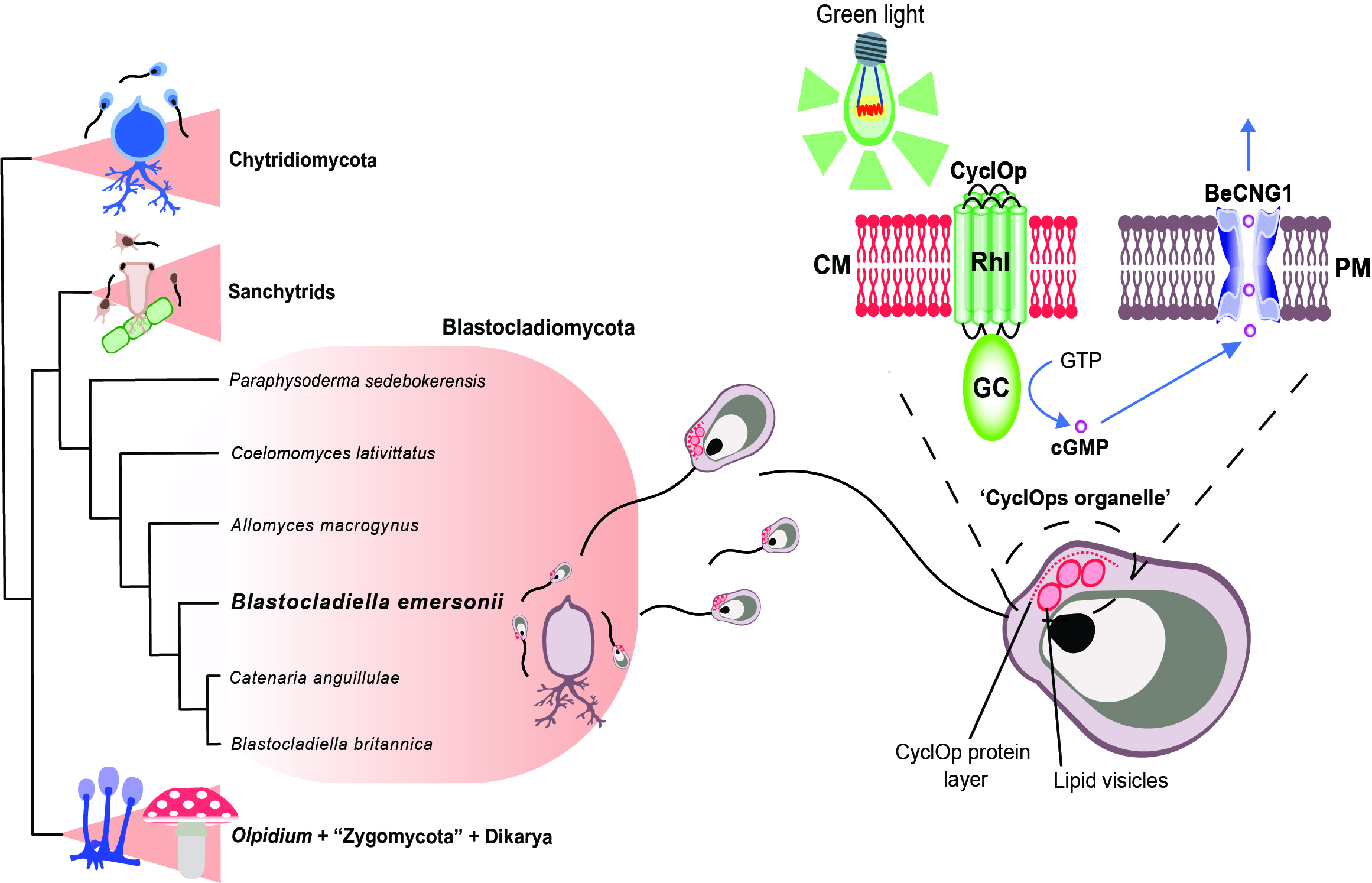 1) The description of a wide diversity of flagellated fungi that possess the CyclOp light response circuit. Thus, showing that the CyclOp system is a highly diversified function present in all three early flagellated fungi phyla (Blastocladiomycota, Sanchytriomycota and Chytridiomycota).