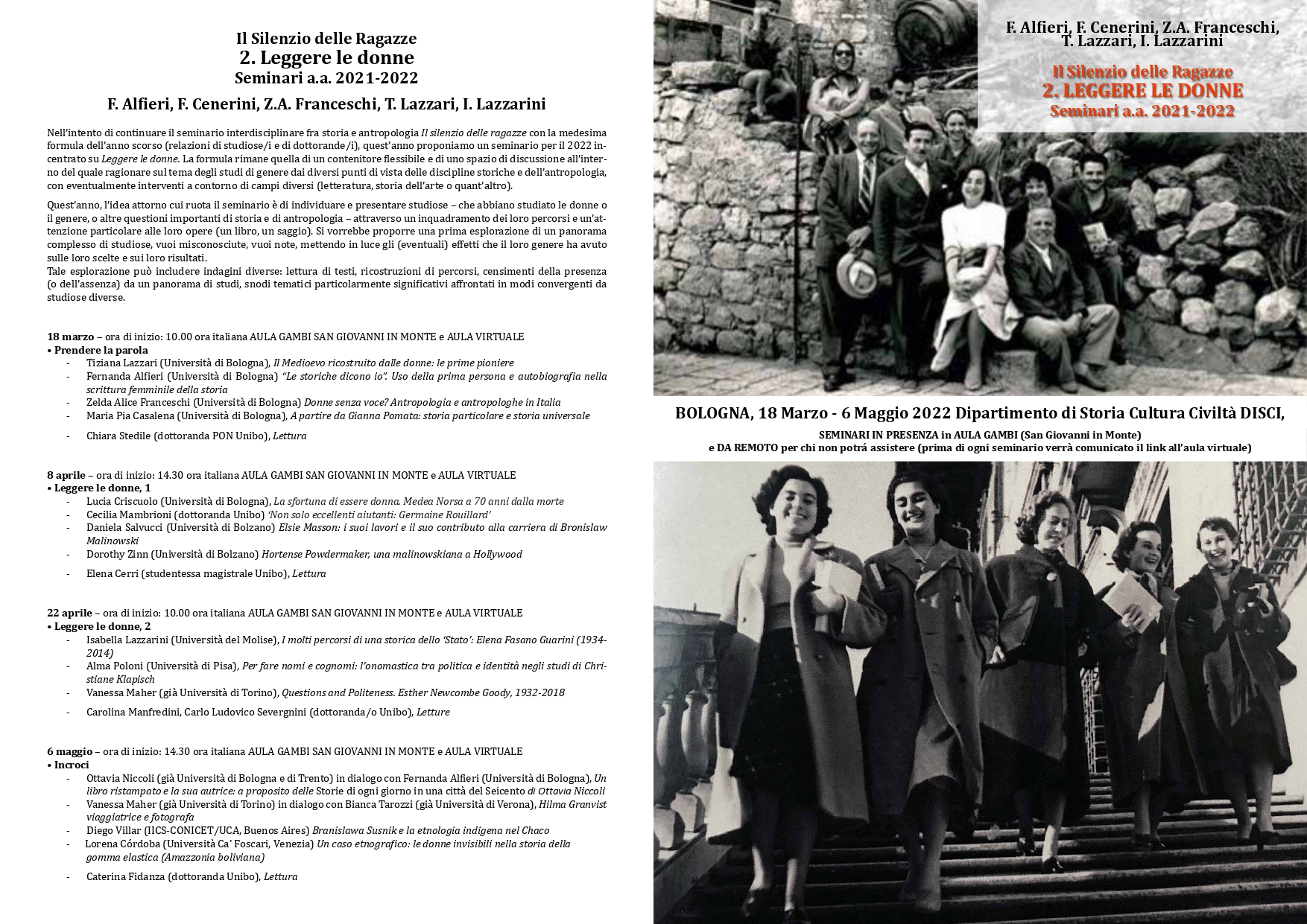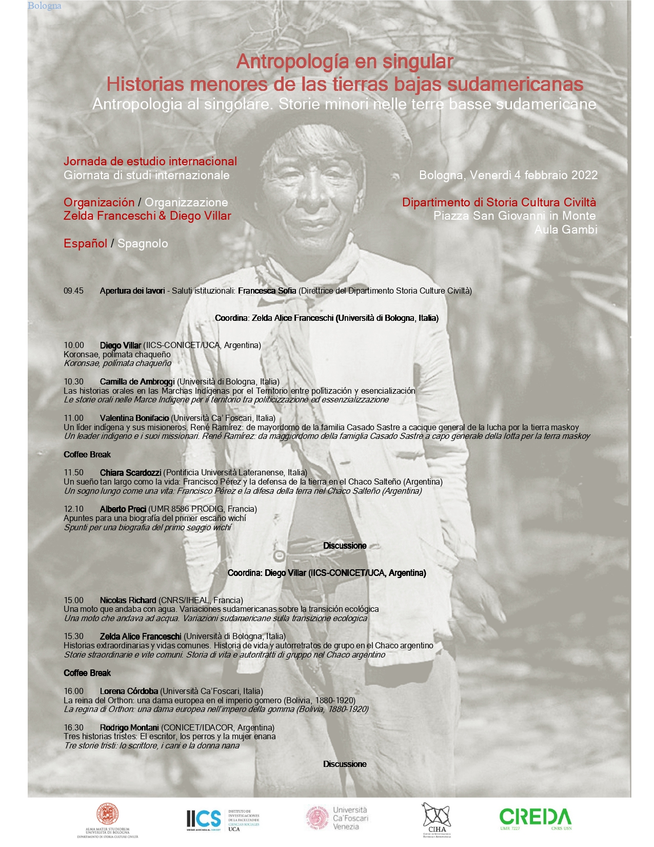 - February 2022: ‘Antropologia al singolare: storie minori nelle terre basse sudamericane’, Bologna University. Paper: ‘La reina del Orthon: una dama europea en el imperio gomero’.