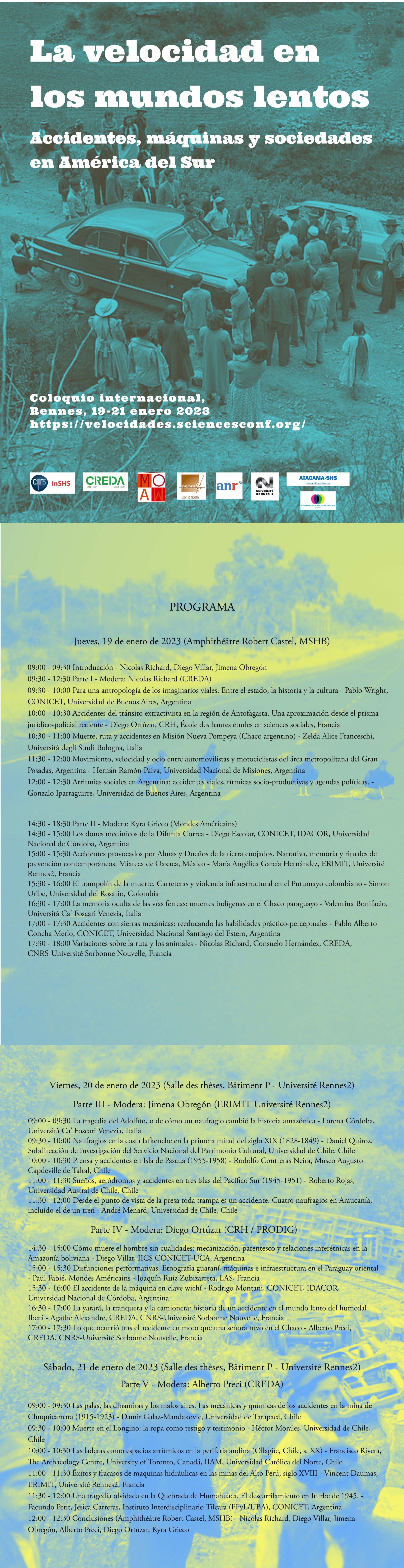 - January 2023: ‘La velocidad de los mundos lentos: accidentes, máquinas y sociedades en América del Sur’, Maison de Sciences de l’homme de Bretagne. Paper: ‘La tragedia del Adolfito, o de cómo un naufragio cambió la historia amazónica’.