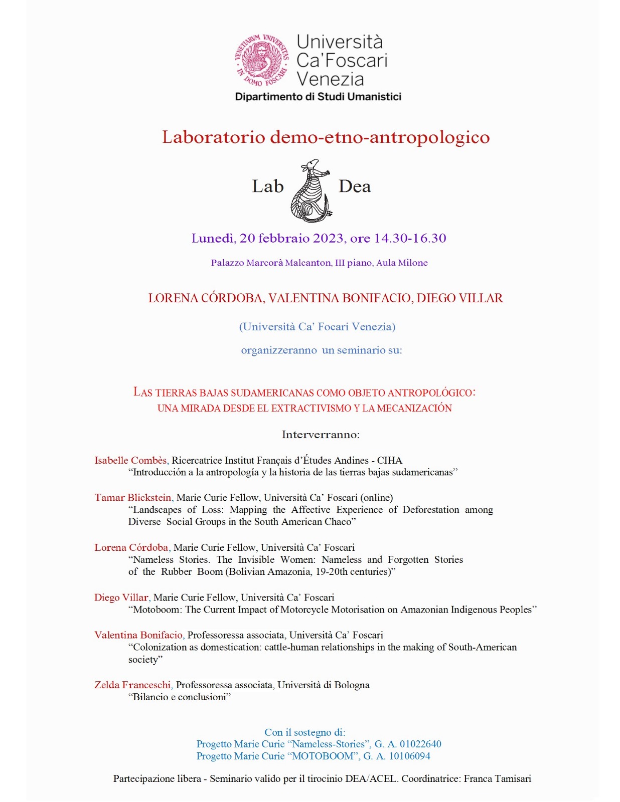 - February 2023: ‘Las Tierras Bajas Sudamericanas como objeto antropológico: una mirada desde el extractivismo y la mecanización’, Ca’ Foscari University. Paper: ‘The Invisible Women’.