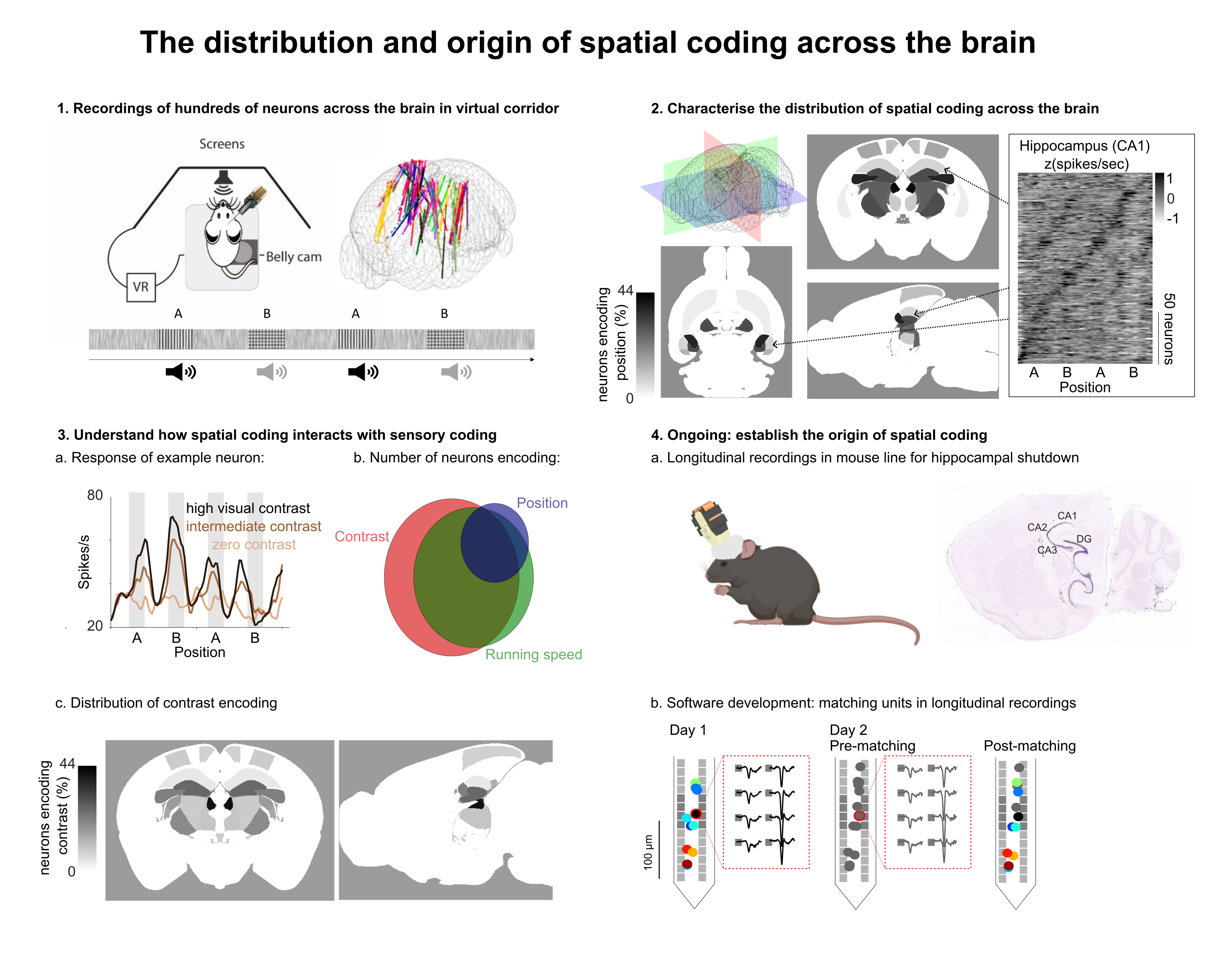In this project we aim to understand the distribution and origin of spatial coding across the brain. We set out three scientific objectives. 1) Characterize the distribution of spatial coding across the mouse brain. 2) Understand how spatial coding interact with sensory coding. 3) Establish the origin of spatial coding in sensory cortex.