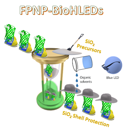 We devised two innovative approaches: one involved the supramolecular modification of carboxylic acid groups, while the other utilized silyl ester functionalization under physiological conditions. These methods resulted in the creation of highly stable monochromatic and dual-emissive FP@SiO2 nanoparticles.These nanoparticles demonstrated exceptional stability and optical properties, even under challenging conditions and in organic solvents. In Bio-HLEDs, coatings with FP@SiO2 achieved complete conversion with high color purity and demonstrated remarkable stability under high-power conditions.