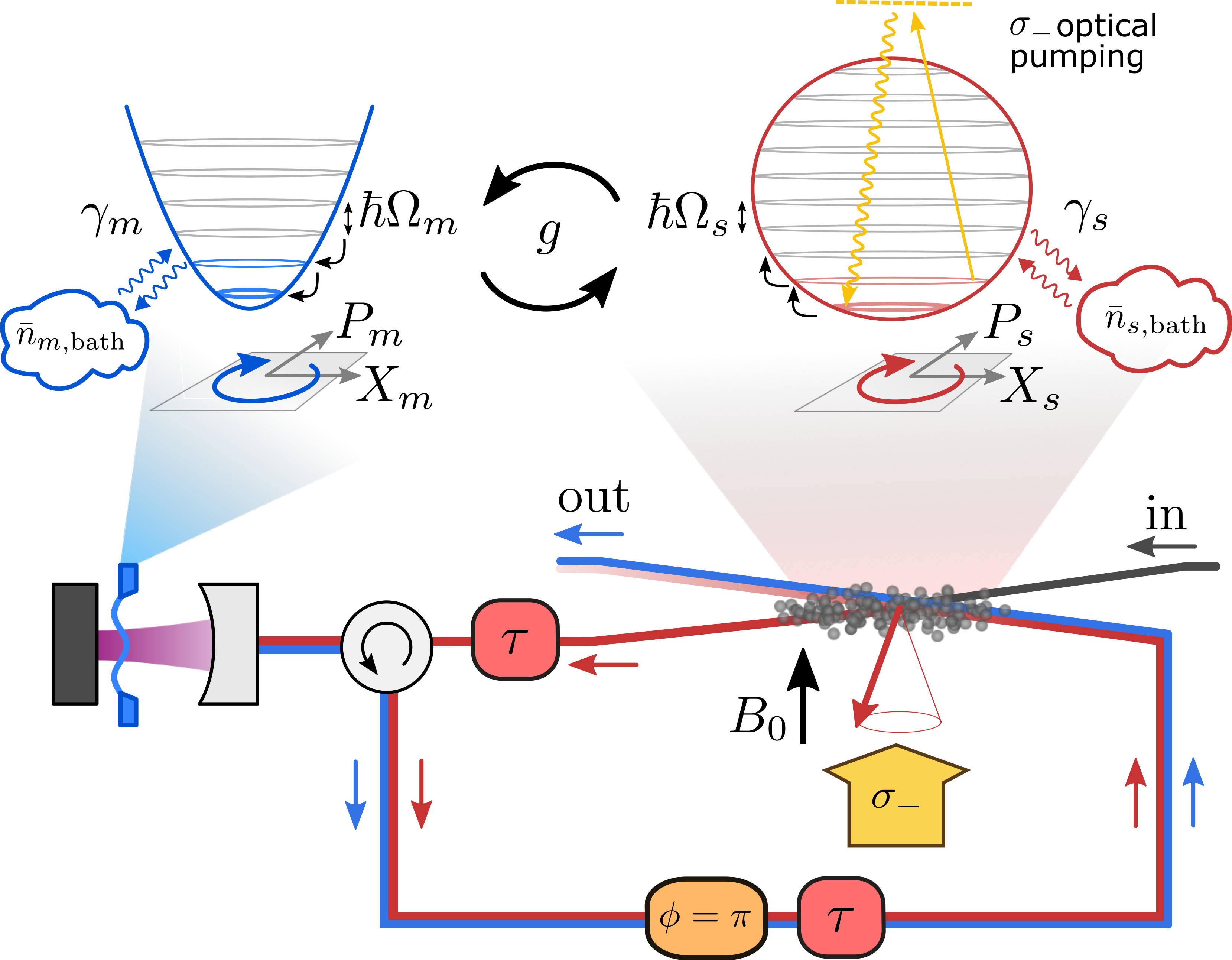 In our hybrid atomic-optomechanical system we coupled the vibrations of a nanomechanical resonator placed in a cavity to the collective spin of a cold rubidium atomic ensemble in a loop geometry (Fig 1). This was accomplished by sending a linearly polarized beam through the atomic ensemble where the signal from the collective spin was imprinted onto the polarization quadratures of the light via the Faraday interaction. These were then converted into an intensity modulation, coupling to the membrane motion through radiation pressure.