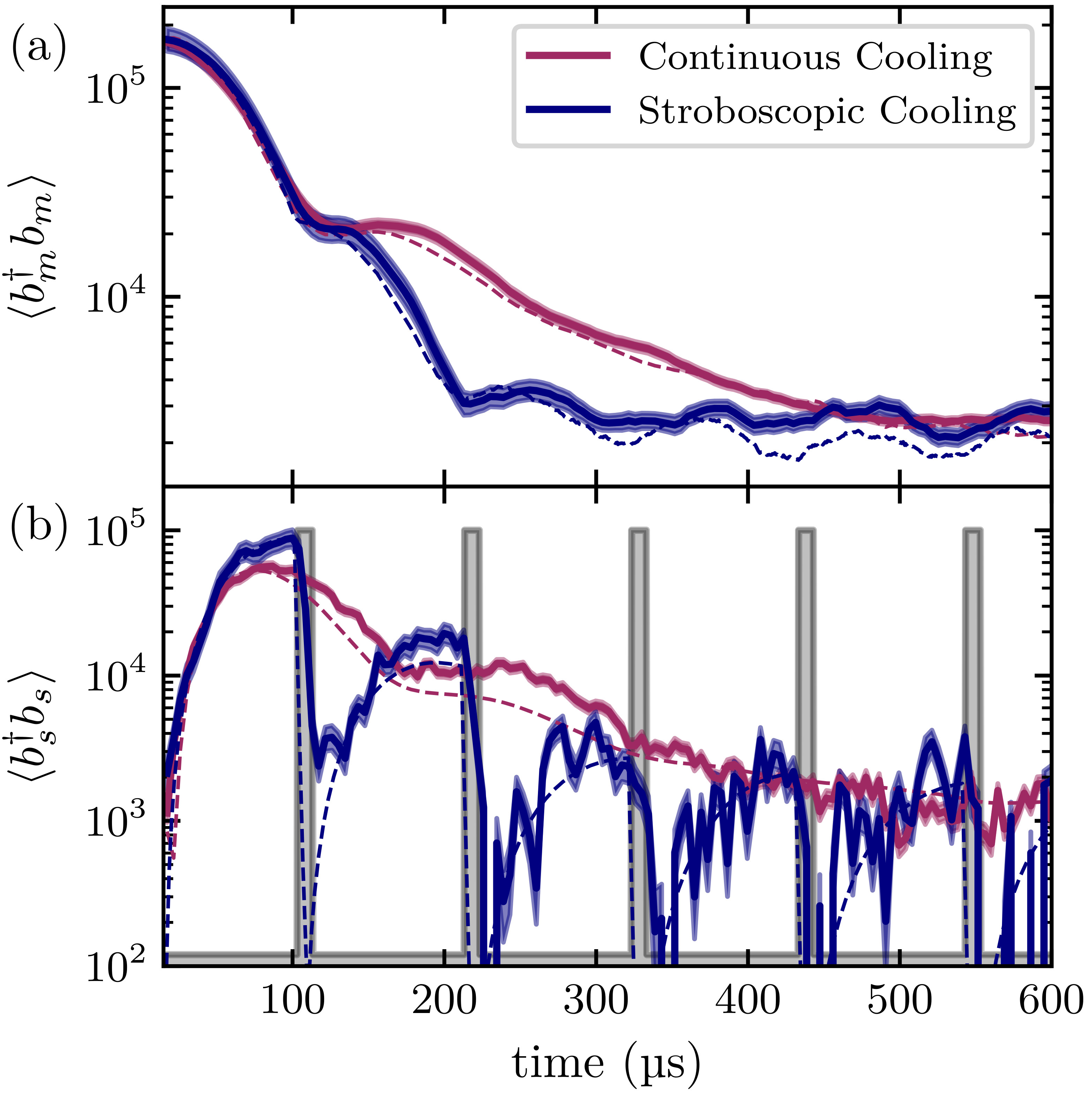 We were able to improve this scheme thanks to the quantum control we have on the spin. By stroboscopically pumping the spin we showed that the steady state was reached twice as fast, yielding a membrane temperature of T = 216 mK in 200 µs in a room temperature environment (Fig 2).
