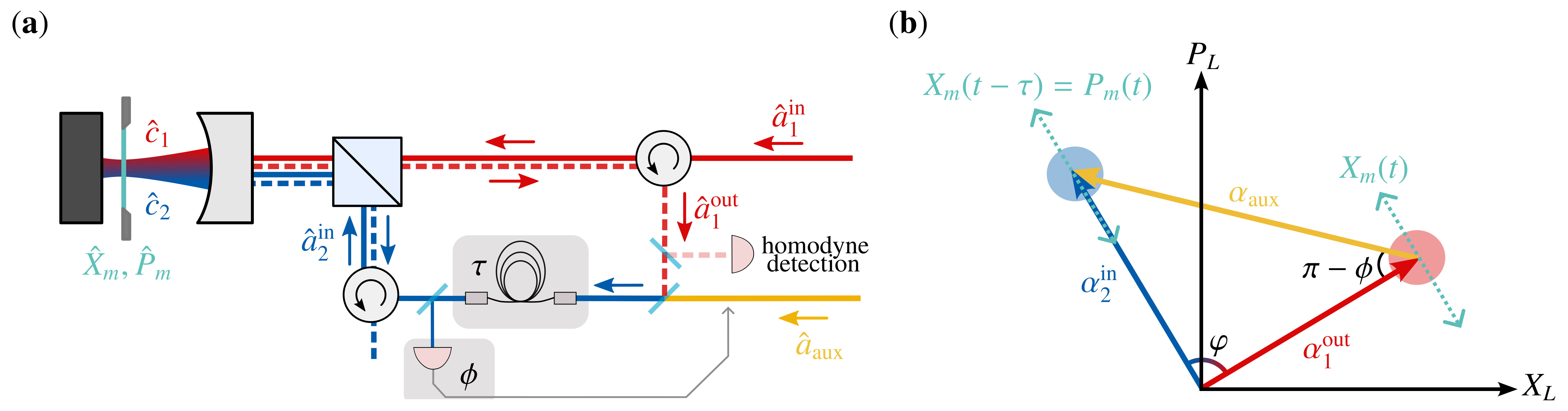 We also fully developed a new coherent feedback platform in an optomechanical system and used it to control and cool the vibrations of a nanomechanical membrane. In our coherent feedback setup a beam of light feeds back signals on a nanomechanical membrane placed inside an optical cavity, by making the beam interact with the membrane multiple times in a closed-loop geometry mediating self-interactions (Fig 3). The originality of the proposed feedback platform is that feedback is directly applied onto the mechanical mode, which interacts twice with the same light field, but on different cavity modes. This allowed to independently tune each interaction by manipulating the light field in between, introducing quadrature rotations and phase shifts, time delays, and in principle even nonlinear optical operations. Tuning the optical phase and delay of the feedback loop allowed us to control the motional state of the mechanical oscillator, its resonance frequency and damping rate, the latter of which we used to cool the membrane close to the quantum ground state. Our theoretical analysis provides the optimal cooling conditions, showing that this new technique enables ground-state cooling. Experimentally, we showed that we can cool the membrane to a state below 5 phonons (480 µK) in a 20 K environment (Fig 4). This lies below the theoretical limit of cavity dynamical backaction cooling in the unresolved sideband regime.